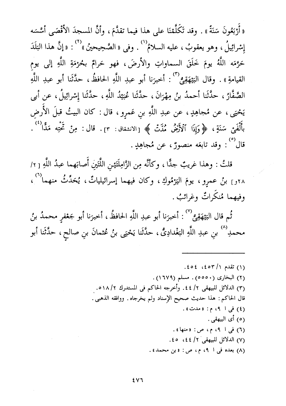 أَرْبَعُونَ سَنَةً» وَقَدْ تَكَلَّمْنَا عَلَى هَذَا فِيمَا تَقَدَّمَ، وَأَنَّ الْمَسْجِدَ الْأَقْصَى أَسَّسَهُ إِسْرَائِيلُ وَهُوَ يَعْقُوبُ عَلَيْهِ السَّلَامُ. وَفِي الصَّحِيحَيْنِ «أَنَّ هَذَا الْبَلَدَ حَرَّمَهُ اللَّهُ يَوْمَ خَلَقَ السَّمَاوَاتِ وَالْأَرْضَ فَهُوَ حَرَامٌ بِحُرْمَةِ اللَّهِ إِلَى يَوْمِ الْقِيَامَةِ» وَقَالَ الْبَيْهَقِيُّ: أَخْبَرَنَا أَبُو عَبْدِ اللَّهِ الْحَافِظُ حَدَّثَنَا أَبُو عَبْدِ اللَّهِ الصَّفَّارُ حَدَّثَنَا أَحْمَدُ بْنُ مِهْرَانَ حَدَّثَنَا عُبَيْدُ اللَّهِ حَدَّثَنَا إِسْرَائِيلُ عَنْ أَبِي يَحْيَى عَنْ مُجَاهِدٍ عَنْ عَبْدِ اللَّهِ بْنِ عَمْرٍو قَالَ: كَانَ الْبَيْتُ قَبْلَ الْأَرْضِ بِأَلْفَيْ سَنَةٍ {وَإِذَا الْأَرْضُ مُدَّتْ} [الانشقاق: 3] قَالَ: مِنْ تَحْتِهِ مَدًّا قَالَ: وَقَدْ تَابَعَهُ مَنْصُورٌ عَنْ مُجَاهِدٍ.