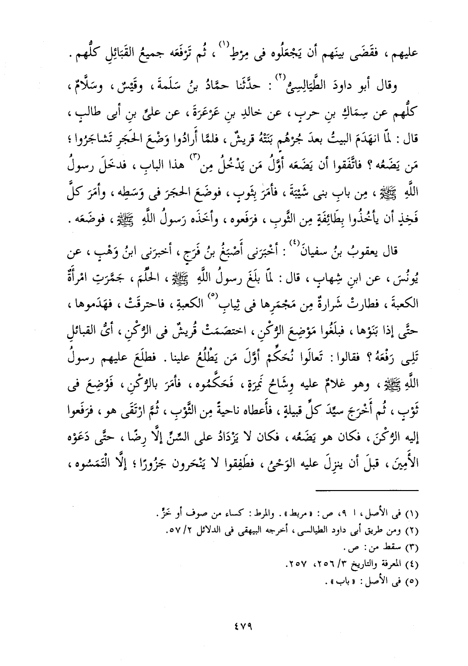 وَقَالَ أَبُو دَاوُدَ الطَّيَالِسِيُّ: حَدَّثَنَا حَمَّادُ بْنُ سَلَمَةَ وَقَيْسٌ وَسَلَّامٌ كُلُّهُمْ عَنْ سِمَاكِ بْنِ حَرْبٍ عَنْ خَالِدِ بْنِ عَرْعَرَةَ عَنْ عَلِيِّ بْنِ أَبِي طَالِبٍ قَالَ: لَمَّا انْهَدَمَ الْبَيْتُ بَعْدَ جُرْهُمٍ بَنَتْهُ قُرَيْشٌ فَلَمَّا أَرَادُوا وَضْعَ الْحَجَرِ تَشَاجَرُوا مَنْ يَضَعُهُ؟ فَاتَّفَقُوا أَنْ يَضَعَهُ أَوَّلُ مَنْ يَدْخُلُ مِنْ هَذَا الْبَابِ فَدَخَلَ رَسُولُ اللَّهِ صَلَّى اللَّهُ عَلَيْهِ وَسَلَّمَ مِنْ بَابِ بَنِي شَيْبَةَ فَأَمَرَ بِثَوْبٍ فَوَضَعَ الْحَجَرَ فِي وَسَطِهِ، وَأَمَرَ كُلَّ فَخْذٍ أَنْ يَأْخُذُوا بِطَائِفَةٍ مِنَ الثَّوْبِ فَرَفَعُوهُ وَأَخَذَهُ رَسُولُ اللَّهِ صَلَّى اللَّهُ عَلَيْهِ وَسَلَّمَ فَوَضَعَهُ.