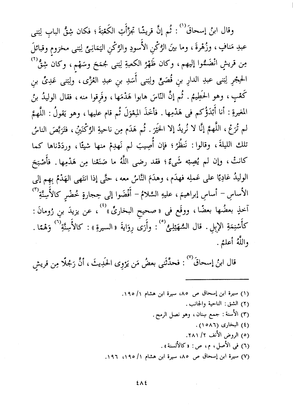 وَقَالَ ابْنُ إِسْحَاقَ: ثُمَّ إِنَّ قُرَيْشًا تَجَزَّأَتِ الْكَعْبَةَ; فَكَانَ شِقُّ الْبَابِ لِبَنِي عَبْدِ مَنَافٍ وَزُهْرَةَ وَمَا بَيْنَ الرُّكْنِ الْأَسْوَدِ وَالرُّكْنِ الْيَمَانِيِّ لِبَنِي مَخْزُومٍ، وَقَبَائِلَ مِنْ قُرَيْشٍ انْضَمُّوا إِلَيْهِمْ وَكَانَ ظَهْرُ الْكَعْبَةِ لِبَنِي جُمَحَ وَسَهْمٍ وَكَانَ شِقُّ الْحِجْرِ لِبَنِي عَبْدِ الدَّارِ بْنِ قُصَيٍّ، وَلِبَنِي أَسَدِ بْنِ عَبْدِ الْعُزَّى، وَلِبَنِي عَدِيِّ بْنِ كَعْبٍ وَهُوَ الْحَطِيمُ، ثُمَّ إِنَّ النَّاسَ هَابُوا هَدْمَهَا وَفَرِقُوا مِنْهُ فَقَالَ الْوَلِيدُ بْنُ الْمُغِيرَةِ أَنَا أَبْدَؤُكُمْ فِي هَدْمِهَا فَأَخَذَ الْمِعْوَلَ ثُمَّ قَامَ عَلَيْهَا وَهُوَ يَقُولُ: اللَّهُمَّ لَمْ تُرَعِ اللَّهُمَّ إِنَّا لَا نُرِيدُ إِلَّا الْخَيْرَ، ثُمَّ هَدَمَ مِنْ نَاحِيَةِ الرُّكْنَيْنِ فَتَرَبَّصَ النَّاسُ تِلْكَ اللَّيْلَةَ، وَقَالُوا: نَنْظُرُ فَإِنْ أُصِيبَ لَمْ نَهْدِمْ مِنْهَا شَيْئًا، وَرَدَدْنَاهَا كَمَا كَانَتْ، وَإِنْ لَمْ يُصِبْهُ شَيْءٌ فَقَدْ رَضِيَ اللَّهُ مَا صَنَعْنَا مِنْ هَدْمِهَا فَأَصْبَحَ الْوَلِيدُ غَادِيًا عَلَى عَمَلِهِ فَهَدَمَ وَهَدَمَ النَّاسُ مَعَهُ حَتَّى إِذَا انْتَهَى الْهَدْمُ بِهِمْ إِلَى الْأَسَاسِ - أَسَاسِ إِبْرَاهِيمَ عَلَيْهِ السَّلَامُ - أَفْضَوْا إِلَى حِجَارَةٍ خُضْرٍ كَالْأَسِنَّةِ آخِذٍ بَعْضُهَا بَعْضًا، وَوَقَعَ فِي صَحِيحِ الْبُخَارِيِّ عَنْ يَزِيدَ بْنِ رُومَانَ: كَأَسْنِمَةِ الْإِبِلِ قَالَ السُّهَيْلِيُّ: وَأَرَى رِوَايَةَ السِّيرَةِ كَالْأَلْسِنَةِ وَهْمًا. وَاللَّهُ أَعْلَمُ.