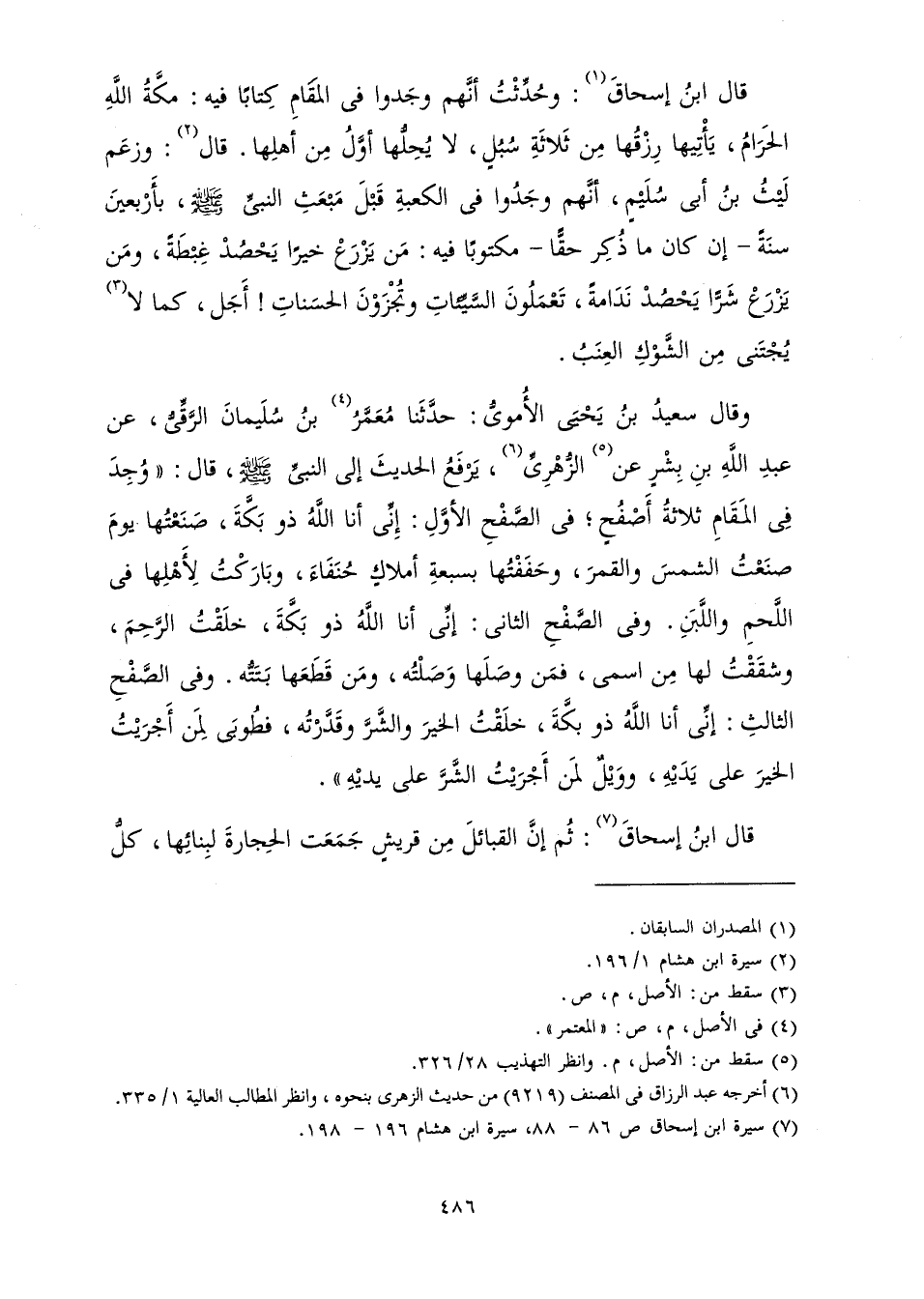 قَالَ ابْنُ إِسْحَاقَ: وَحُدِّثْتُ أَنَّهُمْ وَجَدُوا فِي الْمَقَامِ كِتَابًا فِيهِ: مَكَّةُ اللَّهِ الْحَرَامُ، يَأْتِيهَا رِزْقُهَا مِنْ ثَلَاثَةِ سُبُلٍ لَا يَحِلُّهَا أَوَّلُ مِنْ أَهْلِهَا. قَالَ: وَزَعَمَ لَيْثُ بْنُ أَبِي سُلَيْمٍ أَنَّهُمْ وَجَدُوا فِي الْكَعْبَةِ قَبْلَ مَبْعَثِ النَّبِيِّ صَلَّى اللَّهُ عَلَيْهِ وَسَلَّمَ بِأَرْبَعِينَ سَنَةً - إِنْ كَانَ مَا ذُكِرَ حَقًّا - مَكْتُوبًا فِيهِ: مَنْ يَزْرَعْ خَيْرًا يَحْصُدْ غِبْطَةً، وَمَنْ يَزْرَعْ شَرًّا يَحْصُدْ نَدَامَةً، تَعْمَلُونَ السَّيِّئَاتِ وَتُجْزَوْنَ الْحَسَنَاتِ! أَجَلْ كَمَا يُجْتَنَى مِنَ الشَّوْكِ الْعِنَبُ.