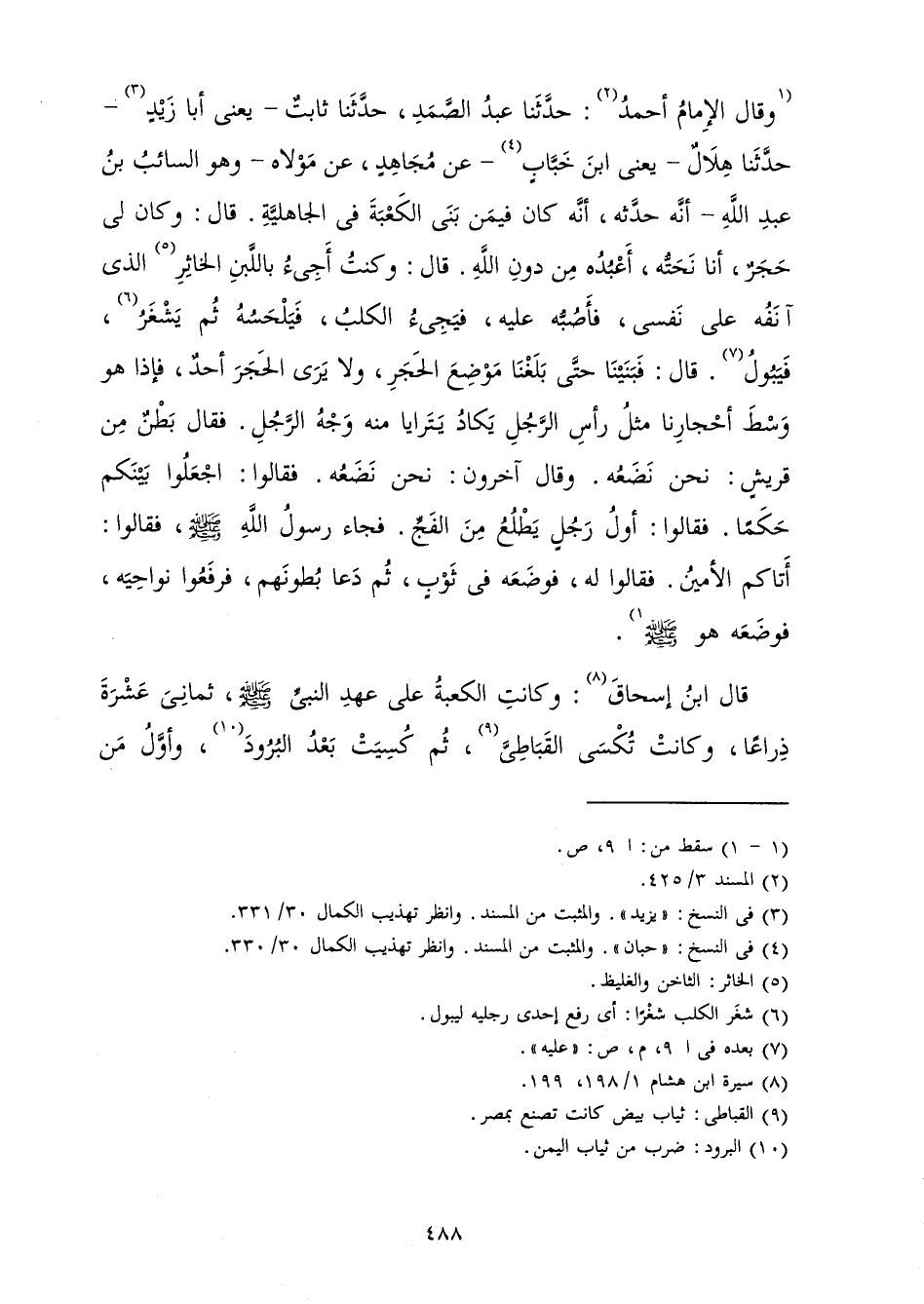 وَقَالَ الْإِمَامُ أَحْمَدُ: حَدَّثَنَا عَبْدُ الصَّمَدِ حَدَّثَنَا ثَابِتٌ - يَعْنِي أَبَا زَيْدٍ - حَدَّثَنَا هِلَالٌ - يَعْنِي ابْنَ خَبَّابٍ - عَنْ مُجَاهِدٍ عَنْ مَوْلَاهُ - وَهُوَ السَّائِبُ بْنُ عَبْدِ اللَّهِ - أَنَّهُ حَدَّثَهُ أَنَّهُ كَانَ فِيمَنْ بَنَى الْكَعْبَةَ فِي الْجَاهِلِيَّةِ، قَالَ: وَكَانَ لِي حَجَرٌ أَنَا نَحَتُّهُ، أَعْبُدُهُ مِنْ دُونِ اللَّهِ قَالَ: وَكُنْتُ أَجِيءُ بِاللَّبَنِ الْخَاثِرِ الَّذِي آنَفُهُ عَلَى نَفْسِي فَأَصُبُّهُ عَلَيْهِ فَيَجِيءُ الْكَلْبُ فَيَلْحَسُهُ، ثُمَّ يَشْغَرُ فَيَبُولُ عَلَيْهِ. قَالَ: فَبَنَيْنَا حَتَّى بَلَغْنَا مَوْضِعَ الْحَجَرِ وَلَا يَرَى الْحَجَرَ أَحَدٌ فَإِذَا هُوَ وَسْطَ أَحْجَارِنَا مِثْلُ رَأْسِ الرَّجُلِ يَكَادُ يَتَرَايَا مِنْهُ وَجْهُ الرَّجُلِ فَقَالَ بَطْنٌ مِنْ قُرَيْشٍ: نَحْنُ نَضَعُهُ، وَقَالَ آخَرُونَ: نَحْنُ نَضَعُهُ فَقَالُوا: اجْعَلُوا بَيْنَكُمْ حَكَمًا فَقَالُوا: أَوَّلُ رَجُلٍ يَطْلُعُ مِنَ الْفَجِّ فَجَاءَ رَسُولُ اللَّهِ صَلَّى اللَّهُ عَلَيْهِ وَسَلَّمَ فَقَالُوا: أَتَاكُمُ الْأَمِينُ فَقَالُوا لَهُ فَوَضَعَهُ فِي ثَوْبٍ، ثُمَّ دَعَا بُطُونَهُمْ فَرَفَعُوا نَوَاحِيَهُ فَوَضَعَهُ هُوَ صَلَّى اللَّهُ عَلَيْهِ وَسَلَّمَ.