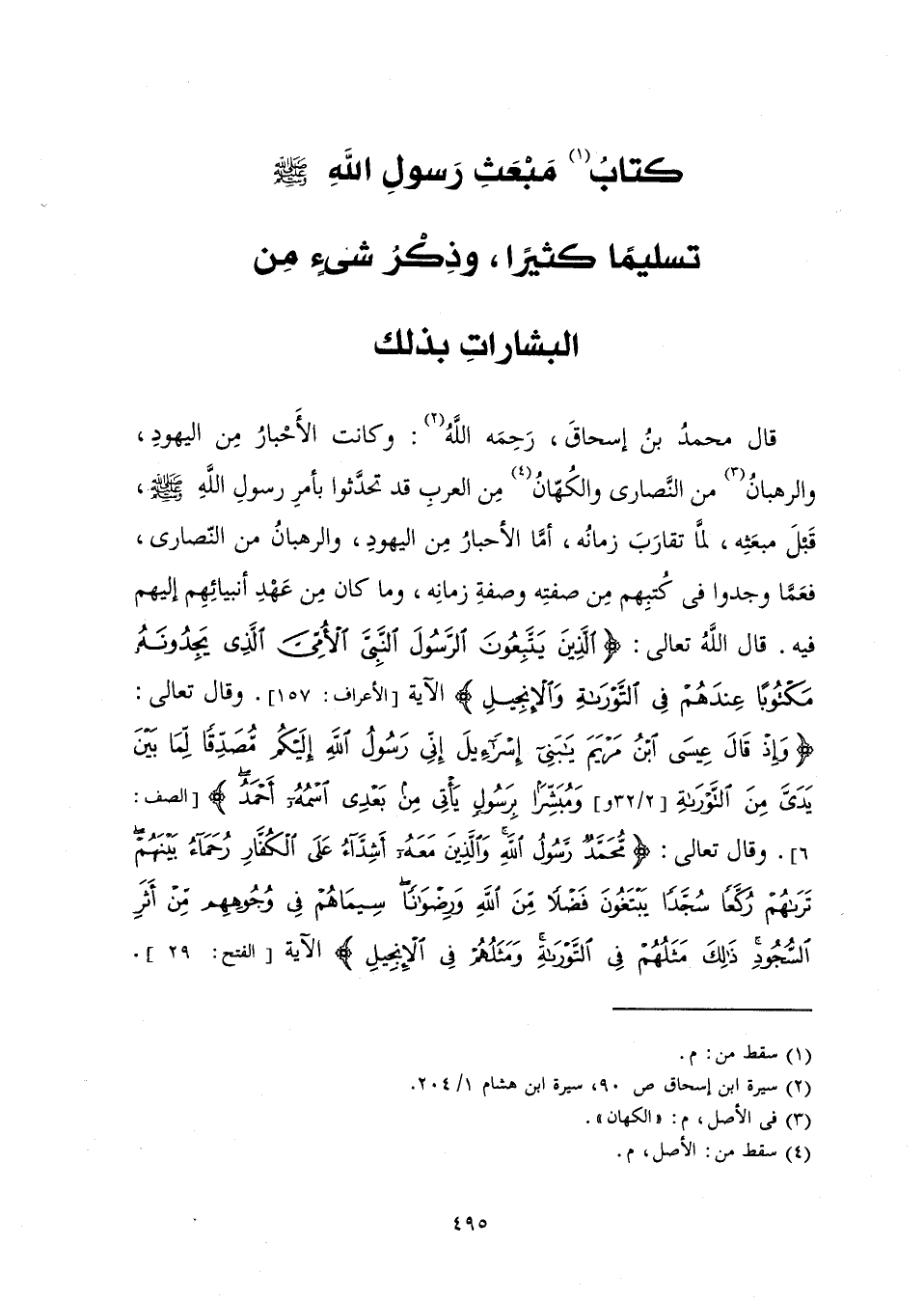 قَالَ مُحَمَّدُ بْنُ إِسْحَاقَ رَحِمَهُ اللَّهُ: وَكَانَتِ الْأَحْبَارُ مِنَ الْيَهُودِ وَالرُّهْبَانُ مِنَ النَّصَارَى وَالْكُهَّانُ مِنَ الْعَرَبِ قَدْ تَحَدَّثُوا بِأَمْرِ رَسُولِ اللَّهِ صَلَّى اللَّهُ عَلَيْهِ وَسَلَّمَ قَبْلَ مَبْعَثِهِ لَمَّا تَقَارَبَ زَمَانُهُ أَمَّا الْأَحْبَارُ مِنَ الْيَهُودِ وَالرُّهْبَانُ مِنَ النَّصَارَى فَعَمَّا وَجَدُوا فِي كُتُبِهِمْ مَنْ صِفَتِهِ وَصِفَةِ زَمَانِهِ وَمَا كَانَ مِنْ عَهْدِ أَنْبِيَائِهِمْ إِلَيْهِمْ فِيهِ قَالَ اللَّهُ تَعَالَى {الَّذِينَ يَتَّبِعُونَ الرَّسُولَ النَّبِيَّ الْأُمِّيَّ الَّذِي يَجِدُونَهُ مَكْتُوبًا عِنْدَهُمْ فِي التَّوْرَاةِ وَالْإِنْجِيلِ} [الأعراف: 157] الْآيَةَ [اَلْأَعْرَافِ: 157] وَقَالَ اللَّهُ تَعَالَى {وَإِذْ قَالَ عِيسَى ابْنُ مَرْيَمَ يَا بَنِي إِسْرَائِيلَ إِنِّي رَسُولُ اللَّهِ إِلَيْكُمْ مُصَدِّقًا لِمَا بَيْنَ يَدَيَّ مِنَ التَّوْرَاةِ وَمُبَشِّرًا بِرَسُولٍ يَأْتِي مِنْ بَعْدِي اسْمُهُ أَحْمَدُ} [الصف: 6] وَقَالَ اللَّهُ تَعَالَى {مُحَمَّدٌ رَسُولُ اللَّهِ وَالَّذِينَ مَعَهُ أَشِدَّاءُ عَلَى الْكُفَّارِ رُحَمَاءُ بَيْنَهُمْ تَرَاهُمْ رُكَّعًا سُجَّدًا يَبْتَغُونَ فَضْلًا مِنَ اللَّهِ وَرِضْوَانًا سِيمَاهُمْ فِي وُجُوهِهِمْ مِنْ أَثَرِ السُّجُودِ ذَلِكَ مَثَلُهُمْ فِي التَّوْرَاةِ وَمَثَلُهُمْ فِي الْإِنْجِيلِ} [الفتح: 29] الْآيَةَ [اَلْفَتْحِ: 29]