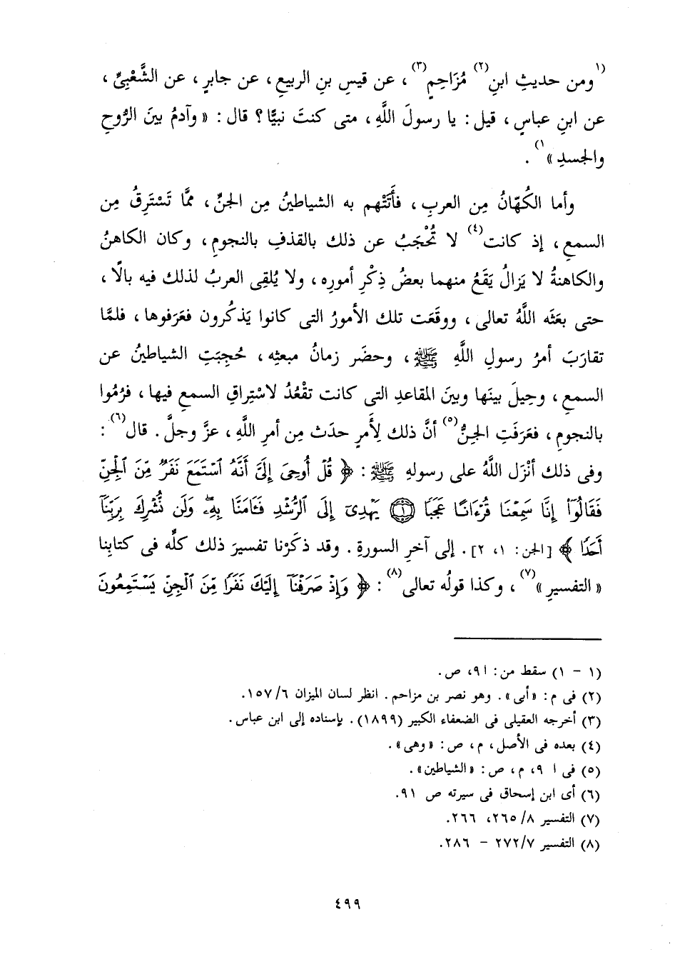 وَأَمَّا الْكُهَّانُ مِنَ الْعَرَبِ فَأَتَتْهُمْ بِهِ الشَّيَاطِينُ مِنَ الْجِنِّ مِمَّا تَسْتَرِقُ مِنَ السَّمْعِ، إِذْ كَانَتْ لَا تُحْجَبُ عَنْ ذَلِكَ بِالْقَذْفِ بِالنُّجُومِ وَكَانَ الْكَاهِنُ وَالْكَاهِنَةُ لَا يَزَالُ يَقَعُ مِنْهُمَا بَعْضُ ذِكْرِ أُمُورِهِ وَلَا يُلْقِي الْعَرَبُ لِذَلِكَ فِيهِ بَالًا حَتَّى بَعَثَهُ اللَّهُ تَعَالَى، وَوَقَعَتْ تِلْكَ الْأُمُورُ الَّتِي كَانُوا يَذْكُرُونَ فَعَرَفُوهَا فَلَمَّا تَقَارَبَ أَمْرُ رَسُولِ اللَّهِ صَلَّى اللَّهُ عَلَيْهِ وَسَلَّمَ وَحَضَرَ زَمَانُ مَبْعَثِهِ حُجِبَتِ الشَّيَاطِينُ عَنِ السَّمْعِ، وَحِيلَ بَيْنَهَا وَبَيْنَ الْمَقَاعِدِ الَّتِي كَانَتْ تَقْعُدُ لِاسْتِرَاقِ السَّمْعِ فِيهَا فَرُمُوا بِالنُّجُومِ فَعَرَفَتِ الْجِنُّ أَنَّ ذَلِكَ لِأَمْرٍ حَدَثَ مِنْ أَمْرِ اللَّهِ عَزَّ وَجَلَّ. قَالَ وَفِي ذَلِكَ أَنْزَلَ اللَّهُ عَلَى رَسُولِهِ صَلَّى اللَّهُ عَلَيْهِ وَسَلَّمَ {قُلْ أُوحِيَ إِلَيَّ أَنَّهُ اسْتَمَعَ نَفَرٌ مِنَ الْجِنِّ فَقَالُوا إِنَّا سَمِعْنَا قُرْآنًا عَجَبًا يَهْدِي إِلَى الرُّشْدِ فَآمَنَّا بِهِ وَلَنْ نُشْرِكَ بِرَبِّنَا أَحَدًا} [الجن: 1]