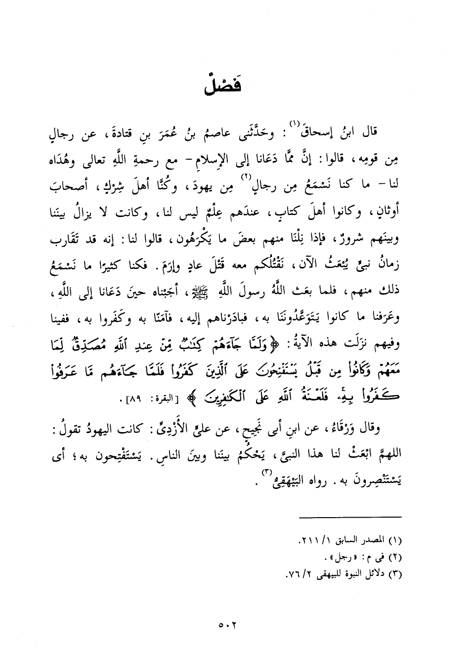 قَالَ ابْنُ إِسْحَاقَ: وَحَدَّثَنِي عَاصِمُ بْنُ عُمَرَ بْنِ قَتَادَةَ عَنْ رِجَالٍ مِنْ قَوْمِهِ قَالُوا: إِنَّ مِمَّا دَعَانَا إِلَى الْإِسْلَامِ - مَعَ رَحْمَةِ اللَّهِ تَعَالَى، وَهَدَاهُ لَنَا - أَنْ كُنَّا نَسْمَعُ مِنْ رَجُلٍ مَنْ يَهُودَ، وَكُنَّا أَهْلَ شِرْكٍ أَصْحَابَ أَوْثَانٍ كَانُوا أَهْلَ كِتَابٍ عِنْدَهُمْ عِلْمٌ لَيْسَ لَنَا، وَكَانَتْ لَا يَزَالُ بَيْنَنَا وَبَيْنَهُمْ شُرُورٌ فَإِذَا نِلْنَا مِنْهُمْ بَعْضَ مَا يَكْرَهُونَ قَالُوا لَنَا: إِنَّهُ قَدْ تَقَارَبَ زَمَانُ نَبِيٍّ يُبْعَثُ الْآنَ نَقْتُلُكُمْ مَعَهُ قَتْلَ عَادٍ وَإِرَمَ فَكُّنَا كَثِيرًا مَا نَسْمَعُ ذَلِكَ مِنْهُمْ فَلَمَّا بَعَثَ اللَّهُ رَسُولَ اللَّهِ صَلَّى اللَّهُ عَلَيْهِ وَسَلَّمَ أَجَبْنَاهُ حِينَ دَعَانَا إِلَى اللَّهِ، وَعَرَفْنَا مَا كَانُوا يَتَوَعَّدُونَنَا بِهِ فَبَادَرْنَاهُمْ إِلَيْهِ فَآمَنَّا بِهِ وَكَفَرُوا بِهِ فَفِينَا وَفِيهِمْ نَزَلَتْ هَذِهِ الْآيَةُ {وَلَمَّا جَاءَهُمْ كِتَابٌ مِنْ عِنْدِ اللَّهِ مُصَدِّقٌ لِمَا مَعَهُمْ وَكَانُوا مِنْ قَبْلُ يَسْتَفْتِحُونَ عَلَى الَّذِينَ كَفَرُوا فَلَمَّا جَاءَهُمْ مَا عَرَفُوا كَفَرُوا بِهِ فَلَعْنَةُ اللَّهِ عَلَى الْكَافِرِينَ} [البقرة: 89] .