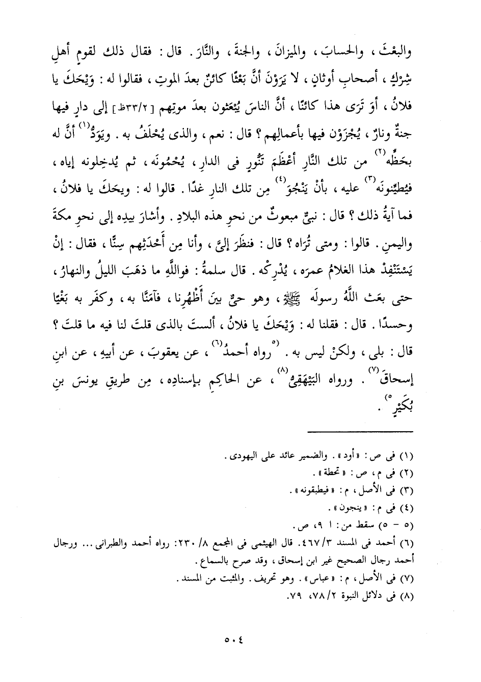 وَالْبَعْثَ وَالْحِسَابَ وَالْمِيزَانَ وَالْجَنَّةَ وَالنَّارَ، قَالَ: فَقَالَ ذَلِكَ لِقَوْمٍ أَهْلِ شِرْكٍ أَصْحَابِ أَوْثَانٍ لَا يَرَوْنَ أَنَّ بَعْثًا كَائِنٌ بَعْدَ الْمَوْتِ فَقَالُوا لَهُ: وَيْحَكَ يَا فُلَانُ أَوَتَرَى هَذَا كَائِنًا أَنَّ النَّاسَ يُبْعَثُونَ بَعْدَ مَوْتِهِمْ إِلَى دَارٍ فِيهَا جَنَّةٌ وَنَارٌ، يُجْزَوْنَ فِيهَا بِأَعْمَالِهِمْ؟ قَالَ: نَعَمْ وَالَّذِي يُحْلَفُ بِهِ، وَيَوَدُّ أَنَّ لَهُ بِحَظِّهِ مِنْ تِلْكَ النَّارِ أَعْظَمَ تَنُّورٍ فِي الدَّارِ يَحْمُونَهُ ثُمَّ يُدْخِلُونَهُ إِيَّاهُ فَيُطَيِّنُونَهُ عَلَيْهِ، بِأَنْ يَنْجُوَ مِنْ تِلْكَ النَّارِ غَدًا قَالُوا لَهُ: وَيْحَكَ يَا فُلَانُ فَمَا آيَةُ ذَلِكَ؟ قَالَ: نَبِيٌّ مَبْعُوثٌ مِنْ نَحْوِ هَذِهِ الْبِلَادِ، وَأَشَارَ بِيَدِهِ إِلَى نَحْوِ مَكَّةَ وَالْيَمَنِ قَالُوا: وَمَتَى تُرَاهُ؟ قَالَ: فَنَظَرَ إِلَيَّ وَأَنَا مِنْ أَحْدَثِهِمْ سِنًّا فَقَالَ: إِنْ يَسْتَنْفِدَ هَذَا الْغُلَامُ عُمُرَهُ يُدْرِكْهُ قَالَ سَلَمَةُ: فَوَاللَّهِ مَا ذَهَبَ اللَّيْلُ وَالنَّهَارُ حَتَّى بَعَثَ اللَّهُ رَسُولَهُ صَلَّى اللَّهُ عَلَيْهِ وَسَلَّمَ وَهُوَ حَيٌّ بَيْنَ أَظْهُرِنَا فَآمَنَّا بِهِ وَكَفَرَ بِهِ بَغْيًا، وَحَسَدًا قَالَ: فَقُلْنَا لَهُ: وَيْحَكَ يَا فُلَانُ أَلَسْتَ بِالَّذِي قُلْتَ لَنَا فِيهِ مَا قُلْتَ؟ قَالَ: بَلَى، وَلَكِنْ لَيْسَ بِهِ. رَوَاهُ أَحْمَدُ عَنْ يَعْقُوبَ عَنْ أَبِيهِ عَنِ ابْنِ عَبَّاسٍ، وَرَوَاهُ الْبَيْهَقِيُّ عَنِ الْحَاكِمِ بِإِسْنَادِهِ مِنْ طَرِيقِ يُونُسَ بْنِ بُكَيْرٍ.