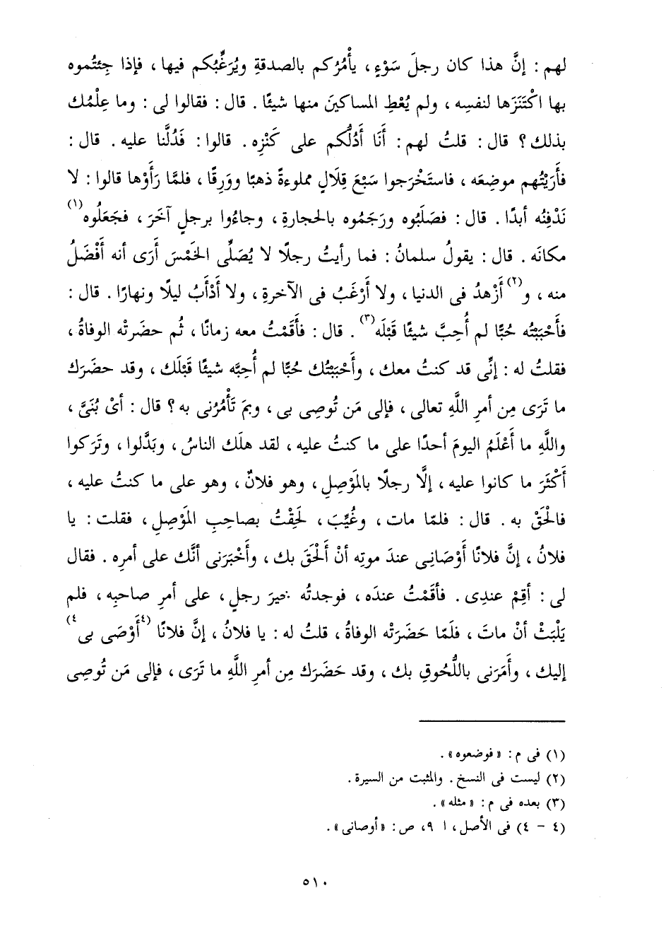 قَالَ: فَأَقَمْتُ مَعَهُ زَمَانًا، ثُمَّ حَضَرَتْهُ الْوَفَاةُ فَقُلْتُ لَهُ: إِنِّي قَدْ كُنْتُ مَعَكَ وَأَحْبَبْتُكَ حُبًّا لَمْ أُحِبَّهُ شَيْئًا قَبْلَكَ، وَقَدْ حَضَرَكَ مَا تَرَى مِنْ أَمْرِ اللَّهِ تَعَالَى فَإِلَى مَنْ تُوصِي بِي وَبِمَ تَأْمُرُنِي بِهِ؟ قَالَ: أَيْ بُنَيَّ وَاللَّهِ مَا أَعْلَمُ الْيَوْمَ أَحَدًا عَلَى مَا كُنْتُ عَلَيْهِ لَقَدْ هَلَكَ النَّاسُ وَبَدَّلُوا وَتَرَكُوا أَكْثَرَ مَا كَانُوا عَلَيْهِ، إِلَّا رَجُلًا بِالْمَوْصِلِ وَهُوَ فُلَانٌ وَهُوَ عَلَى مَا كُنْتُ عَلَيْهِ فَالْحَقْ بِهِ قَالَ: فَلَمَّا مَاتَ وَغُيِّبَ، لَحِقْتُ بِصَاحِبِ الْمَوْصِلِ فَقُلْتُ: يَا فُلَانُ إِنَّ فَلَانًا أَوْصَانِي عِنْدَ مَوْتِهِ أَنْ أَلْحَقَ بِكَ، وَأَخْبَرَنِي أَنَّكَ عَلَى أَمْرِهِ فَقَالَ لِي أَقِمْ عِنْدِي فَأَقَمْتُ عِنْدَهُ فَوَجَدْتُهُ خَيْرَ رَجُلٍ عَلَى أَمْرِ صَاحِبِهِ فَلَمْ يَلْبَثْ أَنْ مَاتَ فَلَمَّا حَضَرَتْهُ الْوَفَاةُ قُلْتُ لَهُ: يَا فُلَانُ إِنَّ فَلَانَا أَوْصَى بِي إِلَيْكَ، وَأَمَرَنِي بِاللُّحُوقِ بِكَ وَقَدْ حَضَرَكَ مِنْ أَمْرِ اللَّهِ مَا تَرَى فَإِلَى مَنْ تُوصِي