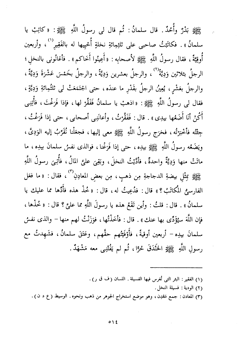 صَلَّى اللَّهُ عَلَيْهِ وَسَلَّمَ بَدْرٌ وَأُحُدٌ قَالَ سَلْمَانُ: ثُمَّ قَالَ لِي رَسُولُ اللَّهِ صَلَّى اللَّهُ عَلَيْهِ وَسَلَّمَ: كَاتِبْ يَا سَلْمَانُ فَكَاتَبْتُ صَاحِبِي عَلَى ثَلَاثِمِائَةِ نَخْلَةٍ أُحْيِيهَا لَهُ بِالْفَقِيرِ وَأَرْبَعِينَ أُوقِيَّةً فَقَالَ رَسُولُ اللَّهِ صَلَّى اللَّهُ عَلَيْهِ وَسَلَّمَ لِأَصْحَابِهِ: أَعِينُوا أَخَاكُمْ فَأَعَانُونِي فِي النَّخْلِ الرَّجُلُ بِثَلَاثِينَ وَدِيَّةً، وَالرَّجُلُ بِعِشْرِينَ وَدِيَّةً، وَالرَّجُلُ بِخَمْسَ عَشْرَةَ وَدِيَّةً، وَالرَّجُلُ بِعَشْرٍ، يُعِينُ الرَّجُلُ بِقَدْرِ مَا عِنْدَهُ حَتَّى اجْتَمَعَتْ لِي ثَلَاثُمِائَةِ وِدِيَّةٍ فَقَالَ لِي رَسُولُ اللَّهِ صَلَّى اللَّهُ عَلَيْهِ وَسَلَّمَ: اذْهَبْ يَا سَلْمَانُ فَفَقِّرْ لَهَا فَإِذَا فَرَغْتَ فَائْتِنِي أَكُنْ أَنَا أَضَعُهَا بِيَدِي. قَالَ: فَفَقَّرْتُ وَأَعَانَنِي أَصْحَابِي حَتَّى إِذَا فَرَغْتُ جِئْتُهُ فَأَخْبَرْتُهُ فَخَرَجَ رَسُولُ اللَّهِ صَلَّى اللَّهُ عَلَيْهِ وَسَلَّمَ مَعِي إِلَيْهَا فَجَعَلْنَا نُقْرِّبُ إِلَيْهِ الْوَدِّيَّ، وَيَضَعُهُ رَسُولُ اللَّهِ صَلَّى اللَّهُ عَلَيْهِ وَسَلَّمَ بِيَدِهِ حَتَّى إِذَا فَرَغْنَا فَوَالَّذِي نَفْسُ سَلْمَانَ بِيَدِهِ مَا مَاتَتْ مِنْهَا وِدِيَّةٌ وَاحِدَةٌ فَأَدَّيْتُ النَّخْلَ وَبَقِيَ عَلَيَّ الْمَالُ فَأُتِيَ رَسُولُ اللَّهِ صَلَّى اللَّهُ عَلَيْهِ وَسَلَّمَ بِمِثْلِ بَيْضَةِ الدَّجَاجَةِ مِنْ ذَهَبٍ مِنْ بَعْضِ الْمَعَادِنِ فَقَالَ: مَا فَعَلَ الْفَارِسِيُّ الْمَكَاتِبُ قَالَ: فَدُعِيتُ لَهُ. قَالَ: خُذْ هَذِهِ فَأَدِّهَا مِمَّا عَلَيْكَ يَا سَلْمَانُ قَالَ: قُلْتُ: وَأَيْنَ تَقَعُ هَذِهِ يَا رَسُولَ اللَّهِ مِمَّا عَلَيَّ؟ قَالَ: خُذْهَا فَإِنَّ اللَّهَ سَيُؤَدِّي بِهَا عَنْكَ قَالَ: فَأَخَذْتُهَا فَوَزَنْتُ لَهُمْ مِنْهَا - وَالَّذِي نَفْسُ سَلْمَانَ بِيَدِهِ - أَرْبَعِينَ أُوقِيَّةً فَأَوْفَيْتُهُمْ حَقَّهُمْ، وَعَتَقَ سَلْمَانُ فَشَهِدْتُ مَعَ رَسُولِ اللَّهِ صَلَّى اللَّهُ عَلَيْهِ وَسَلَّمَ الْخَنْدَقَ حُرًّا، ثُمَّ لَمْ يَفُتْنِي مَعَهُ مَشْهَدٌ.