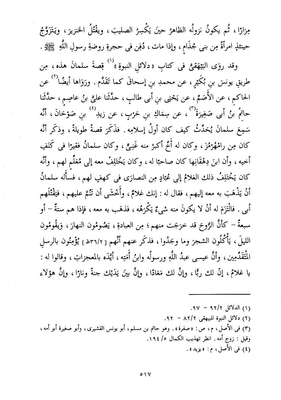 وَقَدْ رَوَى الْبَيْهَقِيُّ فِي كِتَابِ دَلَائِلِ النُّبُوَّةِ قِصَّةَ سَلْمَانَ هَذِهِ مِنْ طَرِيقِ يُونُسَ بْنِ بُكَيْرٍ عَنْ مُحَمَّدِ بْنِ إِسْحَاقَ كَمَا تَقَدَّمَ، وَرَوَاهَا أَيْضًا عَنِ الْحَاكِمِ عَنِ الْأَصَمِّ عَنْ يَحْيَى بْنِ أَبِي طَالِبٍ حَدَّثَنَا عَلِيُّ بْنُ عَاصِمٍ حَدَّثَنَا حَاتِمُ بْنُ أَبِي صَغِيرَةَ عَنْ سِمَاكِ بْنِ حَرْبٍ عَنْ زَيْدِ بْنِ صَوْحَانَ أَنَّهُ سَمِعَ سَلْمَانَ يُحَدِّثُ كَيْفَ كَانَ أَوَّلُ إِسْلَامِهِ فَذَكَرَ قِصَّةً طَوِيلَةً، وَذَكَرَ أَنَّهُ كَانَ مَنْ رَامَهُرْمُزَ وَكَانَ لَهُ أَخٌ أَكْبَرُ مِنْهُ غَنِيٌّ وَكَانَ سَلْمَانُ فَقِيرًا فِي كَنَفِ أَخِيهِ، وَأَنَّ ابْنَ دِهْقَانِهَا كَانَ صَاحِبًا لَهُ وَكَانَ يَخْتَلِفُ مَعَهُ إِلَى مُعَلِّمٍ لَهُمْ، وَأَنَّهُ كَانَ يَخْتَلِفُ ذَلِكَ الْغُلَامُ إِلَى عُبَّادٍ مِنَ النَّصَارَى فِي كَهْفٍ لَهُمْ فَسَأَلَهُ سَلْمَانُ أَنْ يَذْهَبَ بِهِ مَعَهُ إِلَيْهِمْ فَقَالَ لَهُ: إِنَّكَ غُلَامٌ، وَأَخْشَى أَنْ تَنُمَّ عَلَيْهِمْ فَيَقْتُلَهُمْ أَبِي فَالْتَزَمَ لَهُ أَنْ لَا يَكُونُ مِنْهُ شَيْءٌ يَكْرَهُهُ فَذَهَبَ بِهِ مَعَهُ فَإِذَا هُمْ سِتَّةٌ - أَوْ سَبْعَةٌ - كَأَنَّ الرُّوحَ قَدْ خَرَجَتْ مِنْهُمْ مَنَ الْعِبَادَةِ يَصُومُونَ النَّهَارَ، وَيَقُومُونَ اللَّيْلَ يَأْكُلُونَ الشَّجَرَ وَمَا وَجَدُوا فَذَكَرَ عَنْهُمْ أَنَّهُمْ يُؤْمِنُونَ بِالرُّسُلِ الْمُتَقَدِّمِينَ، وَأَنَّ عِيسَى عَبْدُ اللَّهِ وَرَسُولُهُ، وَابْنُ أَمَتِهِ أَيَّدَهُ بِالْمُعْجِزَاتِ.