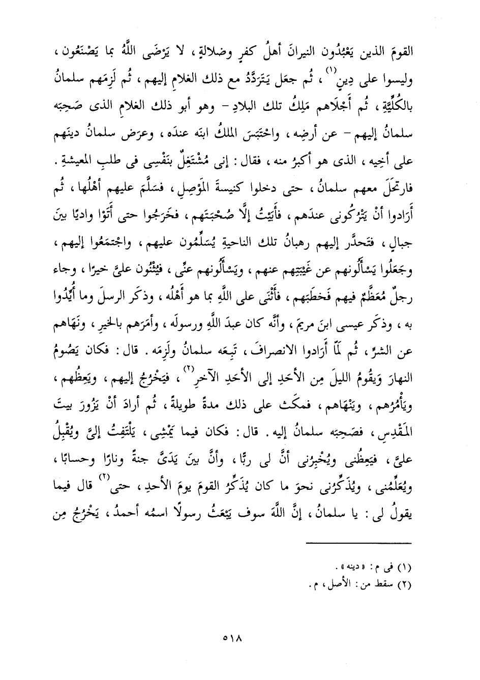 الْقَوْمَ الَّذِينَ يَعْبُدُونَ النِّيرَانَ أَهْلُ كُفْرٍ، وَضَلَالَةٍ لَا يَرْضَى اللَّهُ بِمَا يَصْنَعُونَ وَلَيْسُوا عَلَى دِينِهِ، ثُمَّ جَعَلَ يَتَرَدَّدُ مَعَ ذَلِكَ الْغُلَامِ إِلَيْهِمْ، ثُمَّ لَزِمَهُمْ سَلْمَانُ بِالْكُلِّيَّةِ، ثُمَّ أَجْلَاهُمْ مَلِكُ تِلْكَ الْبِلَادِ - وَهُوَ أَبُو ذَلِكَ الْغُلَامِ الَّذِي صَحِبَهُ سَلْمَانُ إِلَيْهِمْ - عَنْ أَرْضِهِ، وَاحْتَبَسَ الْمَلِكُ ابْنَهُ عِنْدَهُ، وَعَرَضَ سَلْمَانُ دِينَهُمْ عَلَى أَخِيهِ الَّذِي هُوَ أَكْبَرُ مِنْهُ فَقَالَ: إِنِّي مُشْتَغِلٌ بِنَفْسِي فِي طَلَبِ الْمَعِيشَةِ فَارْتَحَلَ مَعَهُمْ سَلْمَانُ حَتَّى دَخَلُوا كَنِيسَةَ الْمَوْصِلِ فَسَلَّمَ عَلَيْهِمْ أَهْلُهَا ثُمَّ أَرَادُوا أَنْ يَتْرُكُونِي عِنْدَهُمْ فَأَبَيْتُ إِلَّا صُحْبَتَهُمْ فَخَرَجُوا حَتَّى أَتَوْا وَادِيًا بَيْنَ جِبَالٍ فَتَحَدَّرَ إِلَيْهِمْ رُهْبَانُ تِلْكَ النَّاحِيَةِ يُسَلِّمُونَ عَلَيْهِمْ وَاجْتَمَعُوا إِلَيْهِمْ، وَجَعَلُوا يَسْأَلُونَهُمْ عَنْ غَيْبَتِهِمْ عَنْهُمْ، وَيَسْأَلُونَهُمْ عَنِّي فَيُثْنُونَ عَلَيَّ خَيْرًا، وَجَاءَ رَجُلٌ مُعَظَّمٌ فِيهِمْ فَخَطَبَهُمْ فَأَثْنَى عَلَى اللَّهِ بِمَا هُوَ أَهْلُهُ، وَذَكَرَ الرُّسُلَ وَمَا أُيِّدُوا بِهِ، وَذَكَرَ عِيسَى ابْنَ مَرْيَمَ وَأَنَّهُ كَانَ عَبْدَ اللَّهِ وَرَسُولَهُ، وَأَمَرَهُمْ بِالْخَيْرِ وَنَهَاهُمْ عَنِ الشَّرِّ، ثُمَّ لَمَّا أَرَادُوا الِانْصِرَافَ تَبِعَهُ سَلْمَانُ وَلَزِمَهُ.