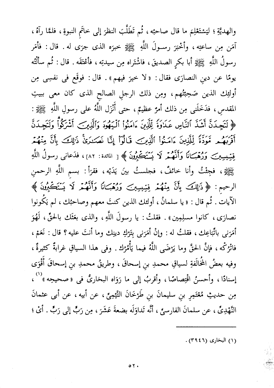 وَالْهَدِيَّةِ; لِيَسْتَعْلِمَ مَا قَالَ صَاحِبُهُ، ثُمَّ تَطَلَّبَ النَّظَرَ إِلَى خَاتَمِ النُّبُوَّةِ فَلَمَّا رَآهُ آمَنَ مِنْ سَاعَتِهِ، وَأَخْبَرَ رَسُولَ اللَّهِ صَلَّى اللَّهُ عَلَيْهِ وَسَلَّمَ خَبَرَهُ الَّذِي جَرَى لَهُ قَالَ فَأَمَرَ رَسُولُ اللَّهِ صَلَّى اللَّهُ عَلَيْهِ وَسَلَّمَ أَبَا بَكْرٍ الصِّدِّيقَ فَاشْتَرَاهُ مِنْ سَيِّدِهِ فَأَعْتَقَهُ، ثُمَّ قَالَ: سَأَلْتُهُ يَوْمًا عَنْ دِينِ النَّصَارَى فَقَالَ: لَا خَيْرَ فِيهِمْ قَالَ: فَوَقَعَ فِي نَفْسِي مِنْ أُولَئِكَ الَّذِينَ صَحِبْتُهُمْ، وَمِنْ ذَلِكَ الرَّجُلِ الصَّالِحِ الَّذِي كَانَ مَعِي بِبَيْتِ الْمَقْدِسِ فَدَخَلَنِي مِنْ ذَلِكَ أَمْرٌ عَظِيمٌ حَتَّى أَنْزَلَ اللَّهُ عَلَى رَسُولِ اللَّهِ صَلَّى اللَّهُ عَلَيْهِ وَسَلَّمَ {لَتَجِدَنَّ أَشَدَّ النَّاسِ عَدَاوَةً لِلَّذِينَ آمَنُوا الْيَهُودَ وَالَّذِينَ أَشْرَكُوا وَلَتَجِدَنَّ أَقْرَبَهُمْ مَوَدَّةً لِلَّذِينَ آمَنُوا الَّذِينَ قَالُوا إِنَّا نَصَارَى ذَلِكَ بِأَنَّ مِنْهُمْ قِسِّيسِينَ وَرُهْبَانًا وَأَنَّهُمْ لَا يَسْتَكْبِرُونَ} [المائدة: 82] فَدَعَانِي رَسُولُ اللَّهِ صَلَّى اللَّهُ عَلَيْهِ وَسَلَّمَ فَجِئْتُ وَأَنَا خَائِفٌ فَجَلَسْتُ بَيْنَ يَدَيْهِ فَقَرَأَ بِسْمِ اللَّهِ الرَّحْمَنِ الرَّحِيمِ {ذَلِكَ بِأَنَّ مِنْهُمْ قِسِّيسِينَ وَرُهْبَانًا وَأَنَّهُمْ لَا يَسْتَكْبِرُونَ} [المائدة: 82] الْآيَاتِ، ثُمَّ قَالَ: يَا سَلْمَانُ أُولَئِكَ الَّذِينَ كُنْتَ مَعَهُمْ، وَصَاحِبُكَ لَمْ يَكُونُوا نَصَارَى كَانُوا مُسْلِمِينَ فَقُلْتُ: يَا رَسُولَ اللَّهِ وَالَّذِي بَعَثَكَ بِالْحَقِّ لَهُوَ أَمَرَنِي بِاتِّبَاعِكَ فَقُلْتُ لَهُ: فَإِنْ أَمَرَنِي بِتَرْكِ دِينِكَ وَمَا أَنْتَ عَلَيْهِ. قَالَ نَعَمْ. فَاتْرُكْهُ فَإِنَّ الْحَقَّ وَمَا يُرْضِي اللَّهَ فِيمَا يَأْمُرُكَ، وَفِي هَذَا السِّيَاقِ غَرَابَةٌ كَثِيرَةٌ، وَفِيهِ بَعْضُ الْمُخَالَفَةِ لِسِيَاقِ مُحَمَّدِ بْنِ إِسْحَاقَ، وَطَرِيقُ مُحَمَّدِ بْنِ إِسْحَاقَ أَقْوَى إِسْنَادًا، وَأَحْسَنُ اقْتِصَاصًا، وَأَقْرَبُ إِلَى مَا رَوَاهُ الْبُخَارِيُّ فِي صَحِيحِهِ مِنْ حَدِيثِ مُعْتَمِرِ بْنِ سُلَيْمَانَ بْنِ طَرْخَانَ التَّيْمِيِّ عَنْ أَبِيهِ عَنْ أَبِي عُثْمَانَ النَّهْدِيِّ عَنْ سَلْمَانَ الْفَارِسِيِّ أَنَّهُ تَدَاوَلَهُ بِضْعَةَ عَشَرَ مِنْ رَبٍّ إِلَى رَبٍّ أَيْ: