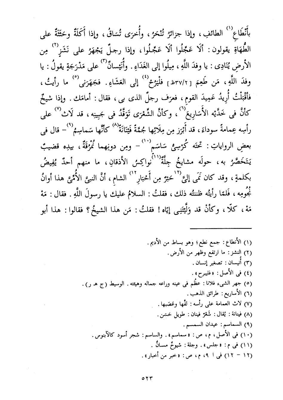 بِأَنْطَاعِ الطَّائِفِ، وَإِذَا جَزَائِرُ تُنْحَرُ وَأُخْرَى تُسَاقُ، وَإِذَا أَكَلَةٌ وَحَثَثَةٌ عَلَى الطُّهَاةِ: يَقُولُونَ أَلَا عَجِّلُوا أَلَا عَجَّلُوا، وَإِذَا رَجُلٌ يَجْهَرُ عَلَى نَشَزٍ مِنَ الْأَرْضِ يُنَادِي: يَا وَفْدَ اللَّهِ مِيلُوا إِلَى الْغَدَاءِ، وَأُنَيْسَانٌ عَلَى مَدْرَجَةٍ يَقُولُ: يَا وَفْدَ اللَّهِ مِنْ طَعِمَ فَلْيَرُحْ إِلَى الْعَشَاءِ فَجَهَرَنِي مَا رَأَيْتُ فَأَقْبَلْتُ أُرِيدُ عَمِيدَ الْقَوْمِ فَعَرَفَ رَجُلٌ الَّذِي بِي فَقَالَ: أَمَامَكَ، وَإِذَا شَيْخٌ كَأَنَّ فِي خَدَّيْهِ الْأَسَارِيعَ وَكَأَنَّ الشِّعْرَى تَوَقَّدُ مِنْ جَبِينِهِ قَدْ لَاثَ عَلَى رَأْسِهِ عِمَامَةً سَوْدَاءَ قَدْ أَبْرَزَ مِنْ مِلَائِهَا جَمَّةً فَيْنَانَةً كَأَنَّهَا سَمَاسِمٌ - قَالَ فِي بَعْضِ الرِّوَايَاتِ: تَحْتَهُ كُرْسِيُّ سَاسَمٍ - وَمِنْ دُونِهَا نُمْرُقَةٌ، بِيَدِهِ قَضِيبٌ يَتَخَصَّرُ بِهِ، حَوْلَهُ مَشَايِخُ جِلَّةٌ نَوَاكِسُ الْأَذْقَانِ مَا مِنْهُمْ أَحَدٌ يُفِيضُ بِكَلِمَةٍ.