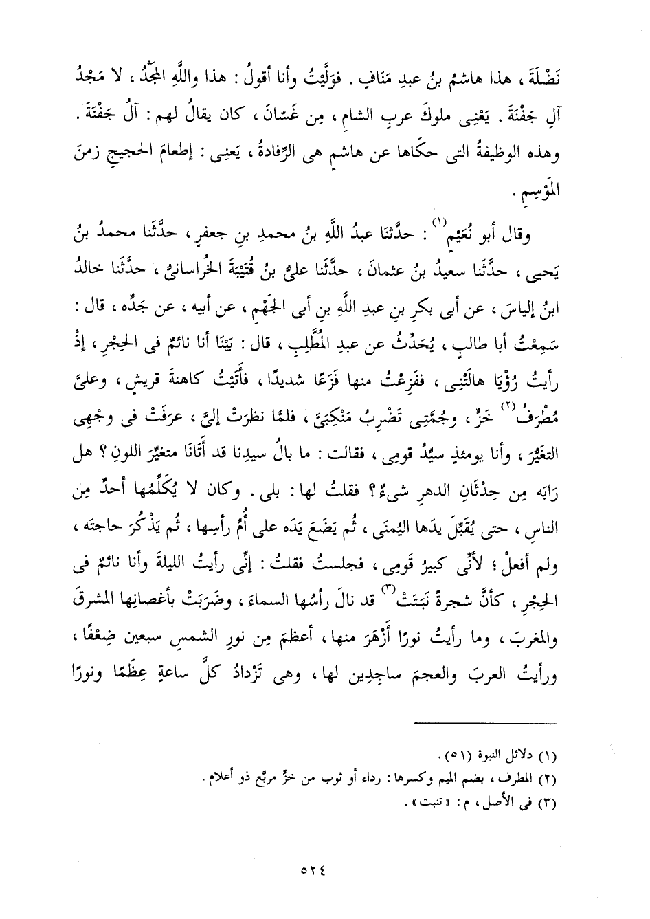 وَقَالَ أَبُو نُعَيْمٍ: حَدَّثَنَا عَبْدُ اللَّهِ بْنُ مُحَمَّدِ بْنِ جَعْفَرٍ حَدَّثَنَا مُحَمَّدُ بْنُ أَحْمَدَ بْنِ أَبِي يَحْيَى حَدَّثَنَا سَعِيدُ بْنُ عُثْمَانَ حَدَّثَنَا عَلِيُّ بْنُ قُتَيْبَةَ الْخُرَاسَانِيُّ حَدَّثَنَا خَالِدُ بْنُ إِلْيَاسَ عَنْ أَبِي بَكْرِ بْنِ عَبْدِ اللَّهِ بْنِ أَبِي الْجَهْمِ عَنْ أَبِيهِ عَنْ جَدِّهِ قَالَ: سَمِعْتُ أَبَا طَالِبٍ يُحَدِّثُ عَنْ عَبْدِ الْمُطَّلِبِ قَالَ: بَيْنَا أَنَا نَائِمٌ فِي الْحِجْرِ إِذْ رَأَيْتُ رُؤْيَا هَالَتْنِي فَفَزِعْتُ مِنْهَا فَزَعًا شَدِيدًا فَأَتَيْتُ كَاهِنَةَ قُرَيْشٍ، وَعَلَيَّ مُطْرَفُ خَزٍّ وَجُمَّتِي تَضْرِبُ مَنْكِبَيَّ فَلَمَّا نَظَرَتْ إِلَيَّ عَرَفَتْ فِي وَجْهِي التَّغَيُّرَ، وَأَنَا يَوْمَئِذٍ سَيِّدُ قَوْمِي فَقَالَتْ: مَا بَالُ سَيِّدِنَا قَدْ أَتَانَا مُتَغَيِّرَ اللَّوْنِ؟ هَلْ رَابَهُ مَنْ حِدْثَانِ الدَّهْرِ شَيْءٌ؟ فَقُلْتُ: لَهَا بَلَى وَكَانَ لَا يُكَلِّمُهَا أَحَدٌ مِنَ النَّاسِ حَتَّى يُقَبِّلَ يَدَهَا الْيُمْنَى، ثُمَّ يَضَعُ يَدَهُ عَلَى أُمِّ رَأْسِهَا، ثُمَّ يَذْكُرُ حَاجَتَهُ، وَلَمْ أَفْعَلْ; لِأَنِّي كَبِيرُ قَوْمِي فَجَلَسْتُ فَقُلْتُ: إِنِّي رَأَيْتُ اللَّيْلَةَ، وَأَنَا نَائِمٌ فِي الْحِجْرِ كَأَنَّ شَجَرَةً نَبَتَتْ قَدْ نَالَ رَأْسُهَا السَّمَاءَ، وَضَرَبَتْ بِأَغْصَانِهَا الْمَشْرِقَ وَالْمَغْرِبَ وَمَا رَأَيْتُ نُورًا أَزْهَرَ مِنْهَا أَعْظَمَ مِنْ نُورِ الشَّمْسِ سَبْعِينَ ضِعْفًا.