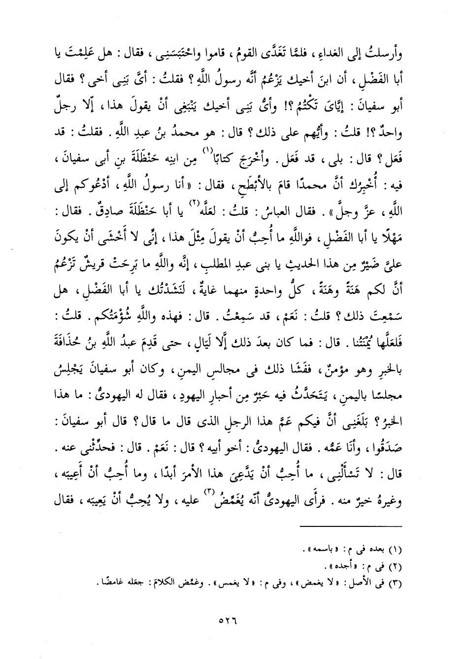 وَأَرْسَلْتُ إِلَى الْغَدَاءِ فَلَمَّا تَغَدَّى الْقَوْمُ قَامُوا وَاحْتَبَسَنِي فَقَالَ: هَلْ عَلِمْتَ يَا أَبَا الْفَضْلِ أَنَّ ابْنَ أَخِيكَ يَزْعُمُ أَنَّهُ رَسُولُ اللَّهِ؟ فَقُلْتُ: أَيُّ بَنِي أَخِي؟ فَقَالَ أَبُو سُفْيَانَ: إِيَّايَ تَكْتُمُ؟! وَأَيُّ بَنِي أَخِيكَ يَنْبَغِي أَنْ يَقُولَ هَذَا إِلَّا رَجُلٌ وَاحِدٌ؟! قُلْتُ: وَأَيُّهُمْ عَلَى ذَلِكَ؟ قَالَ: هُوَ مُحَمَّدُ بْنُ عَبْدِ اللَّهِ فَقُلْتُ: قَدْ فَعَلَ. قَالَ: بَلَى قَدْ فَعَلَ، وَأَخْرَجَ كِتَابًا مِنِ ابْنِهِ حَنْظَلَةَ بْنِ أَبِي سُفْيَانَ فِيهِ: أُخْبِرُكَ أَنَّ مُحَمَّدًا قَامَ بِالْأَبْطَحِ فَقَالَ: أَنَا رَسُولٌ أَدْعُوكُمْ إِلَى اللَّهِ عَزَّ وَجَلَّ فَقَالَ الْعَبَّاسُ: قُلْتُ لَعَلَّهُ يَا أَبَا حَنْظَلَةَ صَادِقٌ. فَقَالَ: مَهْلًا يَا أَبَا الْفَضْلِ فَوَاللَّهِ مَا أُحِبُّ أَنْ يَقُولَ مِثْلَ هَذَا إِنِّي لَا أَخْشَى أَنْ يَكُونَ عَلَيَّ ضَيْرٌ مِنْ هَذَا الْحَدِيثِ يَا بَنِي عَبْدِ الْمُطَّلِبِ إِنَّهُ وَاللَّهِ مَا بَرِحَتْ قُرَيْشٌ تَزْعُمُ أَنَّ لَكُمْ هَنَةً وَهَنَةً، كُلُّ وَاحِدَةٍ مِنْهُمَا غَايَةٌ، لَنَشَدْتُكَ يَا أَبَا الْفَضْلِ هَلْ سَمِعْتَ ذَلِكَ؟ قُلْتُ: نَعَمْ قَدْ سَمِعْتُ. قَالَ: فَهَذِهِ وَاللَّهِ شُؤْمَتُكُمْ. قُلْتُ: فَلَعَلَّهَا يُمْنَتُنَا. قَالَ: فَمَا كَانَ بَعْدَ ذَلِكَ إِلَّا لَيَالٍ حَتَّى قَدِمَ عَبْدُ اللَّهِ بْنُ حُذَافَةَ بِالْخَبَرِ وَهُوَ مُؤْمِنٌ فَفَشَا ذَلِكَ فِي مَجَالِسِ الْيَمَنِ وَكَانَ أَبُو سُفْيَانَ يَجْلِسُ مَجْلِسًا بِالْيَمَنِ يَتَحَدَّثُ فِيهِ حَبْرٌ مِنْ أَحْبَارِ الْيَهُودِ.