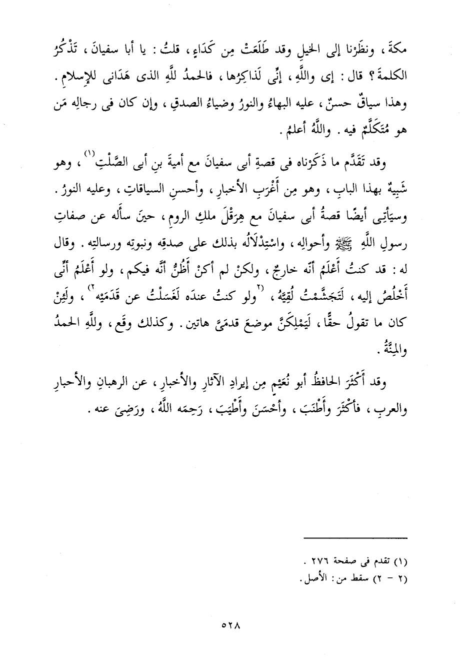 وَقَدْ تَقَدَّمَ مَا ذَكَرْنَاهُ فِي قِصَّةِ أَبِي سُفْيَانَ مَعَ أُمَيَّةَ بْنِ أَبِي الصَّلْتِ وَهُوَ شَبِيهٌ بِهَذَا الْبَابِ وَهُوَ مِنْ أَغْرَبِ الْأَخْبَارِ، وَأَحْسَنِ السِّيَاقَاتِ وَعَلَيْهِ النُّورُ، وَسَيَأْتِي أَيْضًا قِصَّةُ أَبِي سُفْيَانَ مَعَ هِرَقْلَ مَلِكِ الرُّومِ حِينَ سَأَلَهُ عَنْ صِفَاتِ رَسُولِ اللَّهِ صَلَّى اللَّهُ عَلَيْهِ وَسَلَّمَ، وَأَحْوَالِهِ، وَاسْتِدْلَالُهُ بِذَلِكَ عَلَى صِدْقِهِ، وَنُبُوَّتِهِ وَرِسَالَتِهِ، وَقَالَ لَهُ: كُنْتُ أَعْلَمُ أَنَّهُ خَارِجٌ، وَلَكِنْ لَمْ أَكُنْ أَظُنُّ أَنَّهُ فِيكُمْ وَلَوْ أَعْلَمُ أَنِّي أَخْلُصُ إِلَيْهِ لَتَجَشَّمْتُ لُقِيَّهُ وَلَوْ كُنْتُ عِنْدَهُ لَغَسَلْتُ عَنْ قَدَمَيْهِ، وَلَئِنْ كَانَ مَا تَقُولُ حَقًّا; لَيَمْلِكَنَّ مَوْضِعَ قَدَمِيَّ هَاتَيْنِ. وَكَذَلِكَ وَقَعَ وَلِلَّهِ الْحَمْدُ وَالْمِنَّةُ.