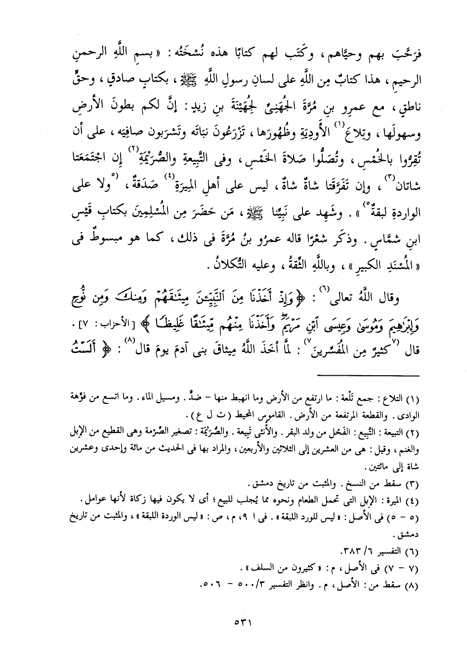 فَرَحَّبَ بِهِمْ وَحَيَّاهُمْ وَكَتَبَ لَهُمْ كِتَابًا، هَذِهِ نُسْخَتُهُ: " بِسْمِ اللَّهِ الرَّحْمَنِ الرَّحِيمِ هَذَا كِتَابٌ مِنَ اللَّهِ عَلَى لِسَانِ رَسُولِ اللَّهِ صَلَّى اللَّهُ عَلَيْهِ وَسَلَّمَ بِكِتَابٍ صَادِقٍ، وَحَقٍّ نَاطِقٍ، مَعَ عَمْرِو بْنِ مُرَّةَ الْجُهَنِيِّ لِجُهَيْنَةَ بْنِ زَيْدٍ: إِنَّ لَكُمْ بُطُونَ الْأَرْضِ وَسُهُولَهَا وَتِلَاعَ الْأَوْدِيَةِ وَظُهُورَهَا، تَزْرَعُونَ نَبَاتَهُ وَتَشْرَبُونَ صَافِيَهَ عَلَى أَنْ تُقِرُّوا بِالْخُمْسِ، وَتُصَلُّوا صَلَاةَ الْخَمْسِ، وَفِي التَّبِيعَةِ وَالصُّرَيْمَةِ إِنِ اجْتَمَعَتَا شَاتَانِ، وَإِنْ تَفَرَّقَتَا شَاةٌ شَاةٌ، لَيْسَ عَلَى أَهْلِ الْمِيرَةِ صَدَقَةٌ وَلَا عَلَى الْوَارِدَةِ لَبْقَةٌ، وَشَهِدَ عَلَى نَبِيِّنَا صَلَّى اللَّهُ عَلَيْهِ وَسَلَّمَ مَنْ حَضَرَ مِنَ الْمُسْلِمِينَ بِكِتَابِ قَيْسِ بْنِ شَمَّاسٍ، وَذَكَرَ شِعْرًا قَالَهُ عَمْرُو بْنُ مُرَّةَ فِي ذَلِكَ كَمَا هُوَ مَبْسُوطٌ فِي الْمُسْنَدِ الْكَبِيرِ، وَبِاللَّهِ الثِّقَةُ وَعَلَيْهِ التُّكْلَانُ.