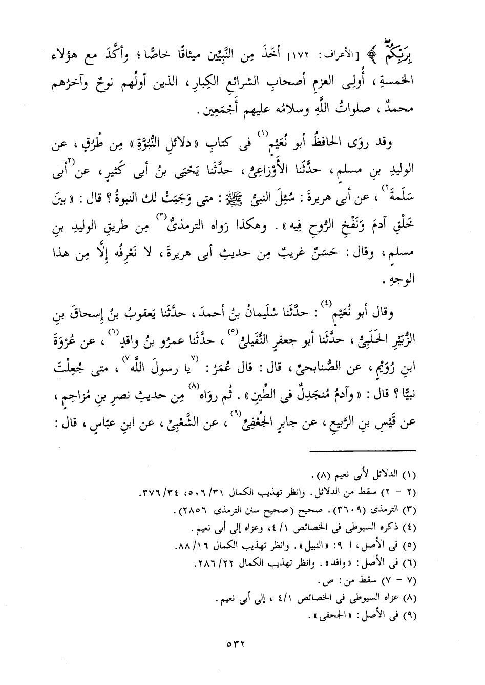 وَقَدْ رَوَى الْحَافِظُ أَبُو نُعَيْمٍ فِي كِتَابِ دَلَائِلِ النُّبُوَّةِ مَنْ طُرُقٍ عَنِ الْوَلِيدِ بْنِ مُسْلِمٍ حَدَّثَنَا الْأَوْزَاعِيُّ حَدَّثَنَا يَحْيَى بْنُ أَبِي كَثِيرٍ عَنْ أَبِي سَلَمَةَ عَنْ أَبِي هُرَيْرَةَ «سُئِلَ النَّبِيُّ صَلَّى اللَّهُ عَلَيْهِ وَسَلَّمَ مَتَى وَجَبَتْ لَكَ النُّبُوَّةُ؟ قَالَ: بَيْنَ خَلْقِ آدَمَ وَنَفْخِ الرُّوحِ فِيهِ» وَهَكَذَا رَوَاهُ التِّرْمِذِيُّ مِنْ طَرِيقِ الْوَلِيدِ بْنِ مُسْلِمٍ، وَقَالَ: حَسَنٌ غَرِيبٌ مِنْ حَدِيثِ أَبِي هُرَيْرَةَ لَا نَعْرِفُهُ إِلَّا مِنْ هَذَا الْوَجْهِ.