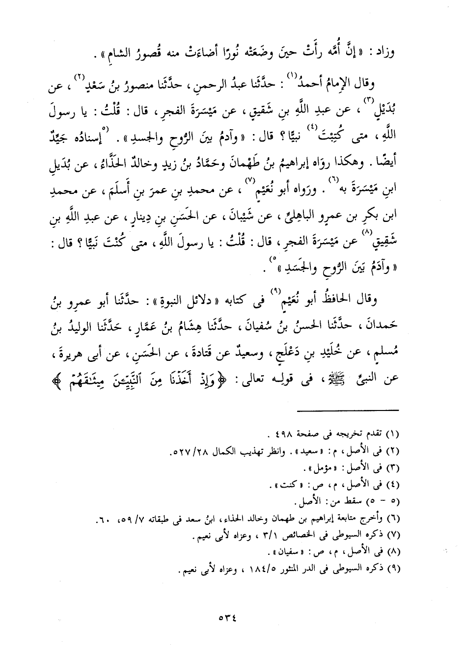 وَقَالَ الْإِمَامُ أَحْمَدُ: حَدَّثَنَا عَبْدُ الرَّحْمَنِ حَدَّثَنَا مَنْصُورُ بْنُ سَعْدٍ عَنْ بُدَيْلٍ عَنْ عَبْدِ اللَّهِ بْنِ شَقِيقٍ عَنْ مَيْسَرَةَ الْفَجْرِ قَالَ «قُلْتُ: يَا رَسُولَ اللَّهِ مَتَى كُتِبْتَ نَبِيًّا؟ قَالَ: وَآدَمُ بَيْنَ الرُّوحِ وَالْجَسَدِ» وَإِسْنَادُهُ جَيِّدٌ أَيْضًا، وَهَكَذَا رَوَاهُ إِبْرَاهِيمُ بْنُ طَهْمَانَ وَحَمَّادُ بْنُ زَيْدٍ وَخَالِدٌ الْحَذَّاءُ عَنْ بُدَيْلِ بْنِ مَيْسَرَةَ بِهِ، وَرَوَاهُ أَبُو نُعَيْمٍ عَنْ مُحَمَّدِ بْنِ عُمَرَ بْنِ أَسْلَمَ عَنْ مُحَمَّدِ بْنِ بَكْرِ بْنِ عَمْرٍو الْبَاهِلِيِّ عَنْ شَيْبَانَ عَنِ الْحَسَنِ بْنِ دِينَارٍ عَنْ عَبْدِ اللَّهِ بْنِ شَقِيقٍ عَنْ مَيْسَرَةَ الْفَجْرِ قَالَ «قُلْتُ: يَا رَسُولَ اللَّهِ مَتَّى كُنْتَ نَبِيًّا؟ قَالَ: وَآدَمُ بَيْنَ الرُّوحِ وَالْجَسَدِ» .