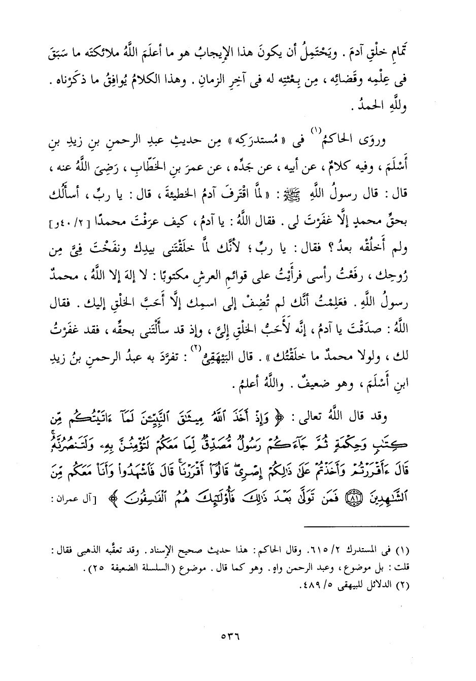 وَرَوَى الْحَاكِمُ فِي مُسْتَدْرَكِهِ مِنْ حَدِيثِ عَبْدِ الرَّحْمَنِ بْنِ زَيْدِ بْنِ أَسْلَمَ، وَفِيهِ كَلَامٌ عَنْ أَبِيهِ عَنْ جَدِّهِ عَنْ عُمَرَ بْنِ الْخَطَّابِ رَضِيَ اللَّهُ عَنْهُ قَالَ قَالَ رَسُولُ اللَّهِ صَلَّى اللَّهُ عَلَيْهِ وَسَلَّمَ: «لَمَّا اقْتَرَفَ آدَمُ الْخَطِيئَةَ قَالَ: يَا رَبِّ أَسْأَلُكَ بِحَقِّ مُحَمَّدٍ إِلَّا غَفَرْتَ لِي. فَقَالَ اللَّهُ: يَا آدَمُ كَيْفَ عَرَفْتَ مُحَمَّدًا، وَلَمْ أَخْلُقْهُ بَعْدُ؟ فَقَالَ: يَا رَبِّ لِأَنَّكَ لَمَّا خَلَقْتَنِي بِيَدِكَ، وَنَفَخْتَ فِيَّ مَنْ رُوحِكَ رَفَعْتُ رَأْسِي فَرَأَيْتُ عَلَى قَوَائِمِ الْعَرْشِ مَكْتُوبًا لَا إِلَهَ إِلَّا اللَّهُ مُحَمَّدٌ رَسُولُ اللَّهِ فَعَلِمْتُ أَنَّكَ لَمْ تُضِفْ إِلَى اسْمِكَ إِلَّا أَحَبَّ الْخَلْقِ إِلَيْكَ. فَقَالَ اللَّهُ: صَدَقْتَ يَا آدَمُ إِنَّهُ لَأَحَبُّ الْخَلْقِ إِلَيَّ، وَإِذْ قَدْ سَأَلْتَنِي بِحَقِّهِ فَقَدْ غَفَرْتُ لَكَ، وَلَوْلَا مُحَمَّدٌ مَا خَلَقْتُكَ» قَالَ الْبَيْهَقِيُّ تَفَرَّدَ بِهِ عَبْدُ الرَّحْمَنِ بْنُ زَيْدِ بْنِ أَسْلَمَ وَهُوَ ضَعِيفٌ. وَاللَّهُ أَعْلَمُ.