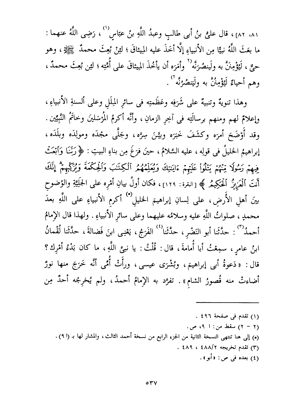 قَالَ عَلِيُّ بْنُ أَبِي طَالِبٍ، وَعَبْدُ اللَّهِ بْنُ عَبَّاسٍ رَضِيَ اللَّهُ عَنْهُمَا: مَا بَعَثَ اللَّهُ نَبِيًّا مِنَ الْأَنْبِيَاءِ إِلَّا أَخَذَ عَلَيْهِ الْمِيثَاقَ لَئِنْ بُعِثَ مُحَمَّدٌ صَلَّى اللَّهُ عَلَيْهِ وَسَلَّمَ وَهُوَ حَيٌّ لَيُؤْمِنَنَّ بِهِ وَلِيَنْصُرَنَّهُ، وَأَمَرَهُ أَنْ يَأْخُذَ الْمِيثَاقَ عَلَى أُمَّتِهِ، لَئِنْ بُعِثَ مُحَمَّدٌ وَهُمْ أَحْيَاءٌ لَيُؤْمِنُنَّ بِهِ وَلِيَنْصُرُنَّهُ.