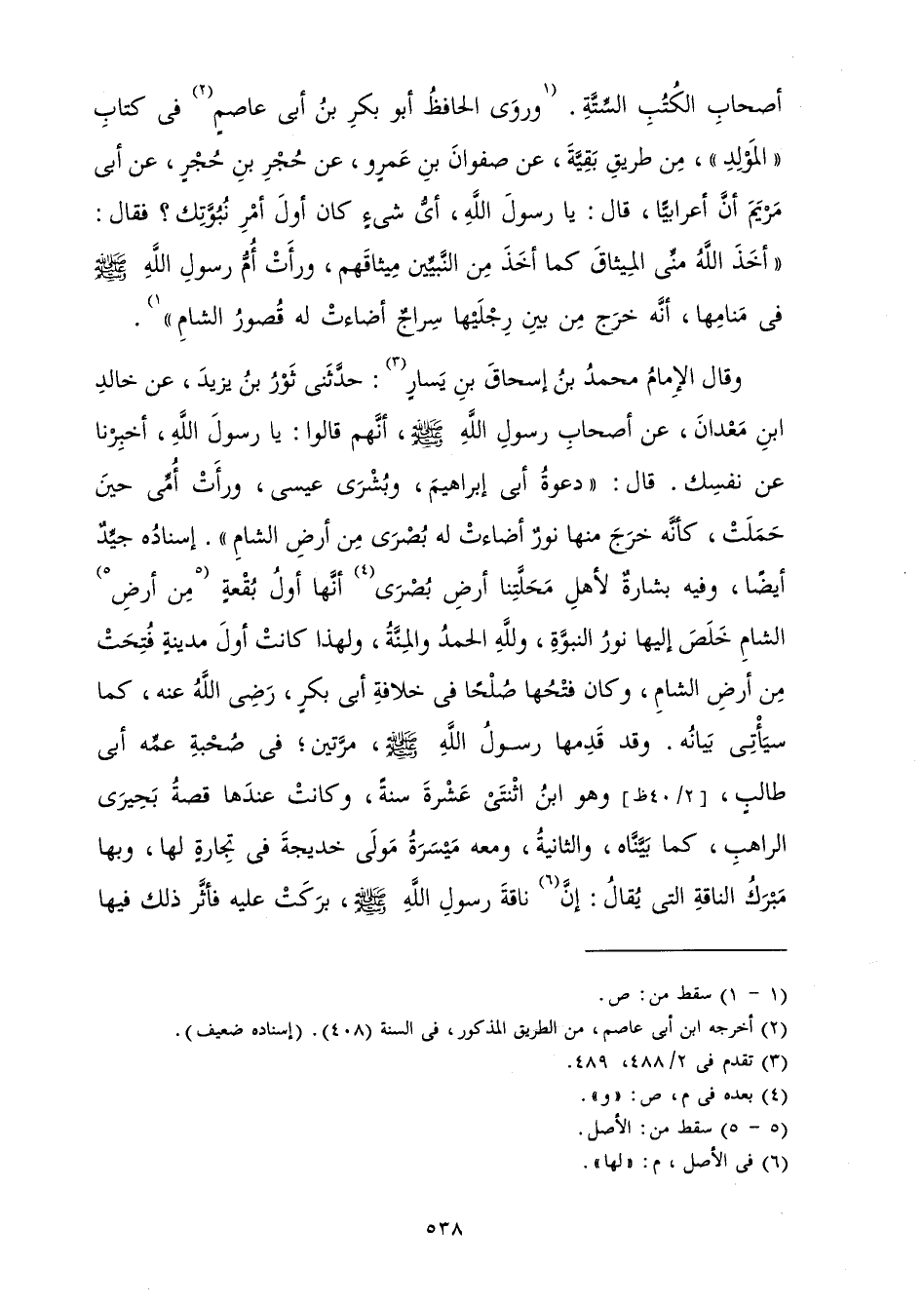 أَصْحَابِ الْكُتُبِ السِّتَّةِ، وَرَوَى الْحَافِظُ أَبُو بَكْرِ بْنُ أَبِي عَاصِمٍ فِي كِتَابِ الْمَوْلِدِ مِنْ طَرِيقِ بَقِيَّةَ عَنْ صَفْوَانَ بْنِ عَمْرٍو، عَنْ حُجْرِ بْنِ حُجْرٍ، عَنْ أَبِي مَرْيَمَ «أَنَّ أَعْرَابِيًّا قَالَ: يَا رَسُولَ اللَّهِ أَيُّ شَيْءٍ كَانَ أَوَّلَ أَمْرِ نُبُوَّتِكَ؟ فَقَالَ: أَخَذَ اللَّهُ مِنِّي الْمِيثَاقَ كَمَا أَخَذَ مِنَ النَّبِيِّينَ مِيثَاقَهُمْ، وَرَأَتْ أَمُّ رَسُولِ اللَّهِ صَلَّى اللَّهُ عَلَيْهِ وَسَلَّمَ فِي مَنَامِهَا أَنَّهُ خَرَجَ مِنْ بَيْنِ رِجْلَيْهَا سِرَاجٌ أَضَاءَتْ لَهُ قُصُورُ الشَّامِ» . .