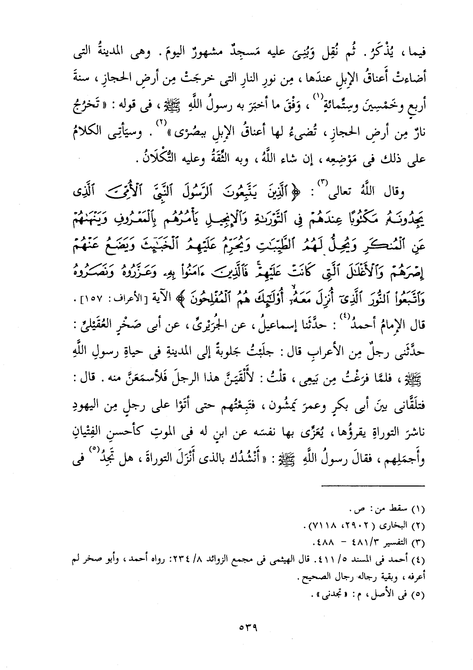 وَقَالَ اللَّهُ تَعَالَى {الَّذِينَ يَتَّبِعُونَ الرَّسُولَ النَّبِيَّ الْأُمِّيَّ الَّذِي يَجِدُونَهُ مَكْتُوبًا عِنْدَهُمْ فِي التَّوْرَاةِ وَالْإِنْجِيلِ يَأْمُرُهُمْ بِالْمَعْرُوفِ وَيَنْهَاهُمْ عَنِ الْمُنْكَرِ وَيُحِلُّ لَهُمُ الطَّيِّبَاتِ وَيُحَرِّمُ عَلَيْهِمُ الْخَبَائِثَ وَيَضَعُ عَنْهُمْ إِصْرَهُمْ وَالْأَغْلَالَ الَّتِي كَانَتْ عَلَيْهِمْ فَالَّذِينَ آمَنُوا بِهِ وَعَزَّرُوهُ وَنَصَرُوهُ وَاتَّبَعُوا النُّورَ الَّذِي أُنْزِلَ مَعَهُ أُولَئِكَ هُمُ الْمُفْلِحُونَ} [الأعراف: 157] الْآيَةَ [اَلْأَعْرَافِ: 157] قَالَ الْإِمَامُ أَحْمَدُ: حَدَّثَنَا إِسْمَاعِيلُ عَنِ الْجُرَيْرِيِّ عَنْ أَبِي صَخْرٍ الْعُقَيْلِيِّ «حَدَّثَنِي رَجُلٌ مِنَ الْأَعْرَابِ قَالَ: جَلَبْتُ جَلُوبَةً إِلَى الْمَدِينَةِ فِي حَيَاةِ رَسُولِ اللَّهِ صَلَّى اللَّهُ عَلَيْهِ وَسَلَّمَ فَلَمَّا فَرَغْتُ مِنْ بَيْعِي قُلْتُ: لَأَلْقَيَنَّ هَذَا الرَّجُلَ فَلْأَسْمَعَنَّ مِنْهُ، قَالَ: فَتَلَقَّانِي بَيْنَ أَبِي بَكْرٍ وَعُمَرَ يَمْشُونَ فَتَبِعْتُهُمْ حَتَّى أَتَوْا عَلَى رَجُلٍ مِنَ الْيَهُودِ نَاشِرَ التَّوْرَاةِ يَقْرَؤُهَا، يُعَزِّي بِهَا نَفْسَهُ عَنِ ابْنٍ لَهُ فِي الْمَوْتِ كَأَحْسَنِ الْفِتْيَانِ وَأَجْمَلِهِمْ فَقَالَ رَسُولُ اللَّهِ صَلَّى اللَّهُ عَلَيْهِ وَسَلَّمَ: أَنْشُدُكَ بِالَّذِي أَنْزَلَ التَّوْرَاةَ هَلْ تَجِدُ فِي