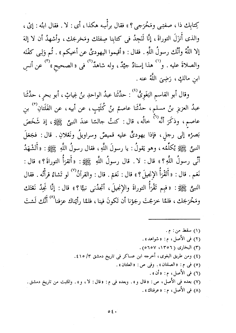 وَقَالَ أَبُو الْقَاسِمِ الْبَغَوِيُّ حَدَّثَنَا عَبْدُ الْوَاحِدِ بْنُ غِيَاثٍ أَبُو بَحْرٍ حَدَّثَنَا عَبْدُ الْعَزِيزِ بْنُ مُسْلِمٍ حَدَّثَنَا عَاصِمُ بْنُ كُلَيْبٍ عَنْ أَبِيهِ عَنِ «الْفَلَتَانِ بْنِ عَاصِمٍ، وَذَكَرَ أَنَّ خَالَهُ قَالَ كُنْتُ جَالِسًا عِنْدَ النَّبِيِّ صَلَّى اللَّهُ عَلَيْهِ وَسَلَّمَ، إِذْ شَخَصَ بَصَرُهُ إِلَى رَجُلٍ فَإِذَا يَهُودِيٌّ عَلَيْهِ قَمِيصٌ وَسَرَاوِيلُ وَنَعْلَانِ، قَالَ: فَجَعَلَ النَّبِيُّ صَلَّى اللَّهُ عَلَيْهِ وَسَلَّمَ يُكَلِّمُهُ وَهُوَ يَقُولُ: يَا رَسُولَ اللَّهِ. فَقَالَ رَسُولُ اللَّهِ صَلَّى اللَّهُ عَلَيْهِ وَسَلَّمَ: أَتَشْهَدُ أَنِّي رَسُولُ اللَّهِ؟ قَالَ: لَا. قَالَ رَسُولُ اللَّهِ صَلَّى اللَّهُ عَلَيْهِ وَسَلَّمَ: أَتَقْرَأُ التَّوْرَاةَ؟ قَالَ: نَعَمْ. قَالَ: أَتَقْرَأُ الْإِنْجِيلَ؟ قَالَ: نَعَمْ. قَالَ: وَالْقُرْآنُ؟ لَوْ تَشَاءُ قَرَأْتُهُ فَقَالَ النَّبِيُّ صَلَّى اللَّهُ عَلَيْهِ وَسَلَّمَ: فَبِمَ تَقْرَأُ التَّوْرَاةَ وَالْإِنْجِيلَ أَتَجِدُنِي نَبِيًّا؟ قَالَ: إِنَّا نَجِدُ نَعْتَكَ وَمَخْرَجَكَ فَلَمَّا خَرَجْتَ رَجَوْنَا أَنْ تَكُونَ فِينَا فَلَمَّا رَأَيْنَاكَ عَرَفْنَا أَنَّكَ لَسْتَ