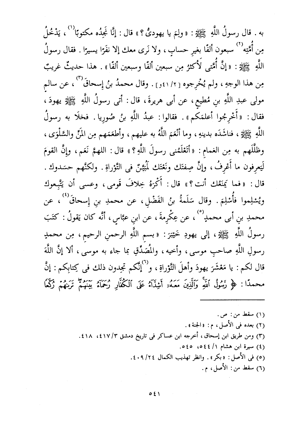 وَقَالَ مُحَمَّدُ بْنُ إِسْحَاقَ: عَنْ سَالِمٍ مَوْلَى عَبْدِ اللَّهِ بْنِ مُطِيعٍ عَنْ «أَبِي هُرَيْرَةَ قَالَ أَتَى رَسُولُ اللَّهِ صَلَّى اللَّهُ عَلَيْهِ وَسَلَّمَ يَهُودَ فَقَالَ: أَخْرِجُوا أَعْلَمَكُمْ. فَقَالُوا: عَبْدُ اللَّهِ بْنُ صُورِيَّا. فَخَلَا بِهِ رَسُولُ اللَّهِ صَلَّى اللَّهُ عَلَيْهِ وَسَلَّمَ فَنَاشَدَهُ بِدِينِهِ وَمَا أَنْعَمَ اللَّهُ بِهِ عَلَيْهِمْ، وَأَطْعَمَهُمْ مِنَ الْمَنِّ وَالسَّلْوَى، وَظَلَّلَهُمْ بِهِ مِنَ الْغَمَامِ أَتَعْلَمُنِي رَسُولَ اللَّهِ؟ قَالَ: اللَّهُمَّ نَعَمْ. وَإِنَّ الْقَوْمَ لَيَعْرِفُونَ مَا أَعْرِفُ، وَإِنَّ صِفَتَكَ وَنَعْتَكَ لَمُبَيَّنٌ فِي التَّوْرَاةِ، وَلَكِنَّهُمْ حَسَدُوكُ قَالَ: فَمَا يَمْنَعُكَ أَنْتَ؟ قَالَ: أَكْرَهُ خِلَافَ قَوْمِي، وَعَسَى أَنْ يَتَّبِعُوكَ وَيُسْلِمُوا فَأُسْلِمُ» ، وَقَالَ سَلَمَةُ بْنُ الْفَضْلِ عَنْ مُحَمَّدِ بْنِ إِسْحَاقَ عَنْ مُحَمَّدِ بْنِ أَبِي مُحَمَّدٍ عَنْ عِكْرِمَةَ عَنِ ابْنِ عَبَّاسٍ أَنَّهُ كَانَ يَقُولُ: «كَتَبَ رَسُولُ اللَّهِ صَلَّى اللَّهُ عَلَيْهِ وَسَلَّمَ إِلَى يَهُودِ خَيْبَرَ: " بِسْمِ اللَّهِ الرَّحْمَنِ الرَّحِيمِ مِنْ مُحَمَّدٍ رَسُولِ اللَّهِ صَاحِبِ مُوسَى وَأَخِيهِ وَالْمُصَدِّقِ بِمَا جَاءَ بِهِ مُوسَى أَلَا إِنَّ اللَّهَ قَالَ لَكُمْ: يَا مَعْشَرَ يَهُودَ، وَأَهْلَ التَّوْرَاةِ إِنَّكُمْ تَجِدُونَ ذَلِكَ فِي كِتَابِكُمْ إِنَّ مُحَمَّدًا: رَسُولُ اللَّهِ وَالَّذِينَ مَعَهُ أَشِدَّاءُ عَلَى الْكُفَّارِ رُحَمَاءُ بَيْنَهُمْ تَرَاهُمْ رُكَّعًا