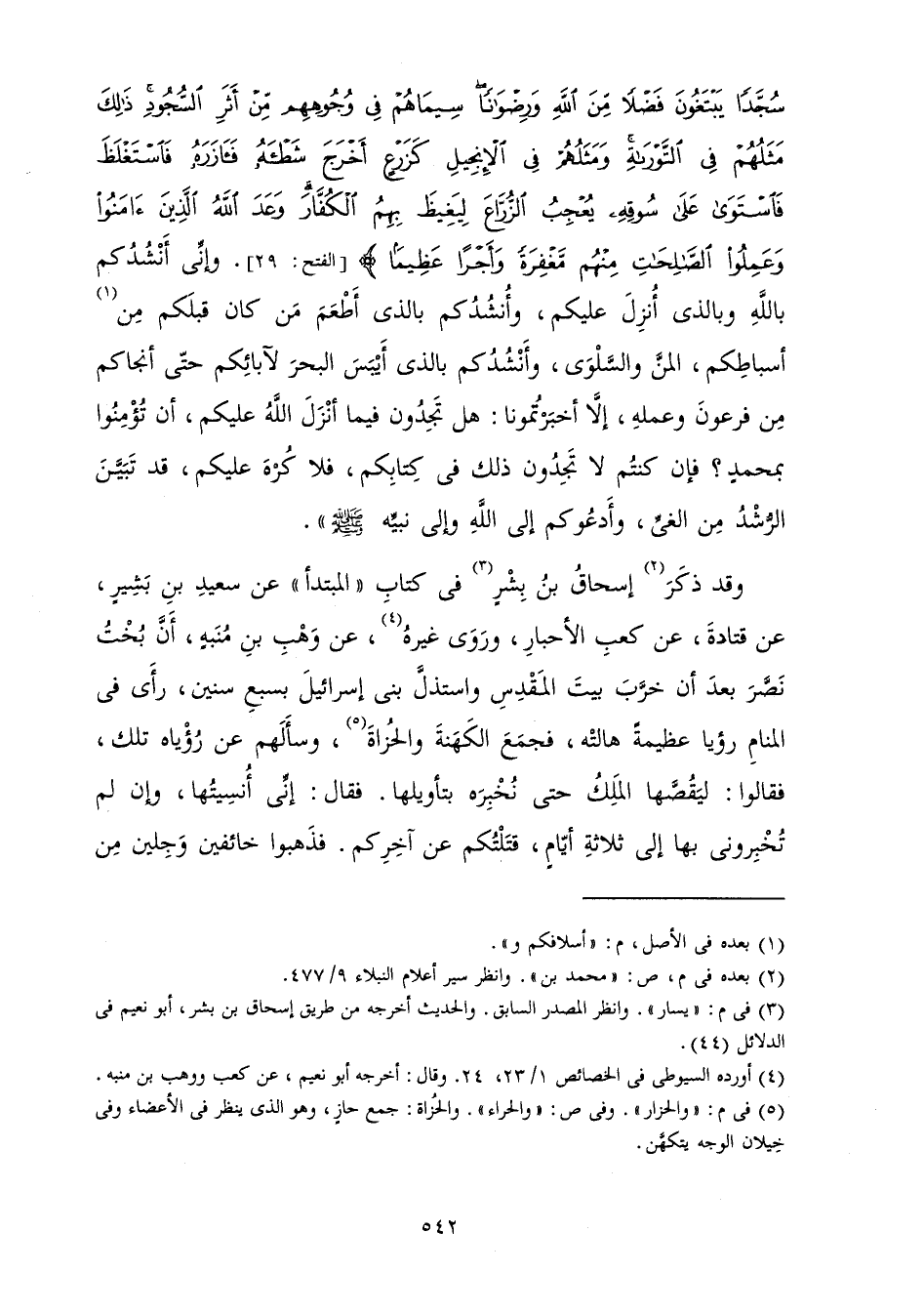 سُجَّدًا يَبْتَغُونَ فَضْلًا مِنَ اللَّهِ وَرِضْوَانًا سِيمَاهُمْ فِي وُجُوهِهِمْ مِنْ أَثَرِ السُّجُودِ ذَلِكَ مَثَلُهُمْ فِي التَّوْرَاةِ وَمَثَلُهُمْ فِي الْإِنْجِيلِ كَزَرْعٍ أَخْرَجَ شَطْأَهُ فَآزَرَهُ فَاسْتَغْلَظَ فَاسْتَوَى عَلَى سُوقِهِ يُعْجِبُ الزُّرَّاعَ لِيَغِيظَ بِهِمُ الْكُفَّارَ وَعَدَ اللَّهُ الَّذِينَ آمَنُوا وَعَمِلُوا الصَّالِحَاتِ مِنْهُمْ مَغْفِرَةً وَأَجْرًا عَظِيمًا [اَلْفَتْحِ: 29] . وَإِنِّي أَنْشُدُكُمْ بِاللَّهِ، وَبِالَّذِي أُنْزِلَ عَلَيْكُمْ، وَأَنْشُدُكُمْ بِالَّذِي أَطْعَمَ مَنْ كَانَ قَبْلَكُمْ مِنْ أَسْلَافِكُمْ وَأَسْبَاطِكُمُ الْمَنَّ وَالسَّلْوَى، وَأَنْشُدُكُمْ بِالَّذِي أَيْبَسَ الْبَحْرَ لِآبَائِكُمْ حَتَّى أَنْجَاكُمْ مَنْ فِرْعَوْنَ وَعَمَلِهِ، إِلَّا أَخْبَرْتُمُونَا: هَلْ تَجِدُونَ فِيمَا أَنْزَلَ اللَّهُ عَلَيْكُمْ أَنْ تُؤْمِنُوا بِمُحَمَّدٍ؟ فَإِنْ كُنْتُمْ لَا تَجِدُونَ ذَلِكَ فِي كِتَابِكُمْ فَلَا كُرْهَ عَلَيْكُمْ قَدْ تَبَيَّنَ الرُّشْدُ مِنَ الْغَيِّ، وَأَدْعُوكُمْ إِلَى اللَّهِ وَإِلَى نَبِيِّهِ صَلَّى اللَّهُ عَلَيْهِ وَسَلَّمَ» .
