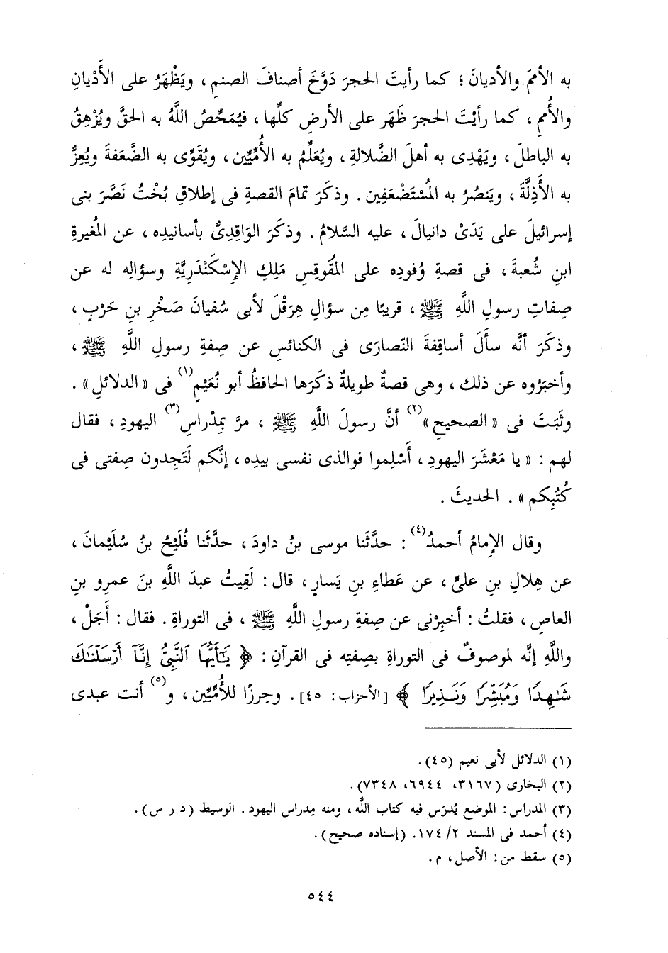 بِهِ الْأُمَمَ وَالْأَدْيَانَ، كَمَا رَأَيْتَ الْحَجَرَ دَوَّخَ أَصْنَافَ الصَّنَمِ، وَيَظْهَرُ عَلَى الْأَدْيَانِ وَالْأُمَمِ، كَمَا رَأَيْتَ الْحَجَرَ ظَهَرَ عَلَى الْأَرْضِ كُلِّهَا فَيُمَحِّصُ اللَّهُ بِهِ الْحَقَّ، وَيُزْهِقُ بِهِ الْبَاطِلَ، وَيَهْدِي بِهِ أَهْلَ الضَّلَالَةِ، وَيُعَلِّمُ بِهِ الْأُمِّيِّينَ، وَيُقَوِّي بِهِ الضَّعَفَةَ، وَيَعِزُّ بِهِ الْأَذِلَّةَ، وَيَنْصُرُ بِهِ الْمُسْتَضْعَفِينَ. وَذَكَرَ تَمَامَ الْقِصَّةِ فِي إِطْلَاقِ بُخْتَنَصَّرَ بَنِي إِسْرَائِيلَ عَلَى يَدَيْ دَانْيَالَ عَلَيْهِ السَّلَامُ، وَذَكَرَ الْوَاقِدِيُّ بِأَسَانِيدِهِ عَنِ الْمُغِيرَةِ بْنِ شُعْبَةَ فِي قِصَّةِ وُفُودِهِ عَلَى الْمُقَوْقِسِ مَلِكِ الْإِسْكَنْدَرِيَّةِ، وَسُؤَالِهِ لَهُ عَنْ صِفَاتِ رَسُولِ اللَّهِ صَلَّى اللَّهُ عَلَيْهِ وَسَلَّمَ قَرِيبًا مِنْ سُؤَالِ هِرَقْلَ لِأَبِي سُفْيَانَ صَخْرِ بْنِ حَرْبٍ، وَذَكَرَ أَنَّهُ سَأَلَ أَسَاقِفَةَ النَّصَارَى فِي الْكَنَائِسِ عَنْ صِفَةِ رَسُولِ اللَّهِ صَلَّى اللَّهُ عَلَيْهِ وَسَلَّمَ، وَأَخْبَرُوهُ عَنْ ذَلِكَ، وَهِيَ قِصَّةٌ طَوِيلَةٌ ذَكَرَهَا الْحَافِظُ أَبُو نُعَيْمٍ فِي الدَّلَائِلِ. وَثَبَتَ فِي الصَّحِيحِ، أَنَّ رَسُولَ اللَّهِ صَلَّى اللَّهُ عَلَيْهِ وَسَلَّمَ «مَرَّ بِمِدْرَاسِ الْيَهُودِ فَقَالَ لَهُمْ: يَا مَعْشَرَ الْيَهُودِ أَسْلِمُوا فَوَالَّذِي نَفْسِي بِيَدِهِ إِنَّكُمْ لَتَجِدُونَ صِفَتِي فِي كُتُبِكُمْ» الْحَدِيثَ.