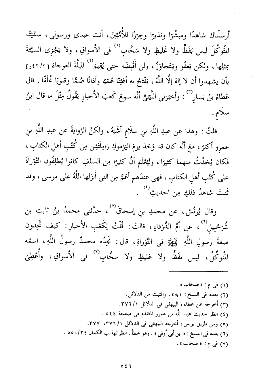 أَرْسَلْنَاكَ شَاهِدًا وَمُبَشِّرًا وَنَذِيرًا، وَحِرْزًا لِلْأُمِّيِّينَ أَنْتَ عَبْدِي وَرَسُولِي، سَمَّيْتُهُ الْمُتَوَكِّلَ لَيْسَ بِفَظٍّ وَلَا غَلِيظٍ وَلَا سَخَّابَ فِي الْأَسْوَاقِ وَلَا يَجْزِي السَّيِّئَةَ بِمِثْلِهَا، وَلَكِنْ يَعْفُو وَيَتَجَاوَزُ، وَلَنْ أَقْبِضَهُ حَتَّى يُقِيمَ الْمِلَّةَ الْعَوْجَاءَ; بِأَنْ يَشْهَدُوا أَنْ لَا إِلَهَ إِلَّا اللَّهُ. يَفْتَحُ بِهِ أَعْيُنًا عُمْيًا وَآذَانًا صُمًّا وَقُلُوبًا غُلْفًا» وَقَالَ عَطَاءُ بْنُ يَسَارٍ، وَأَخْبَرَنِي اللَّيْثِيُّ أَنَّهُ سَمِعَ كَعْبَ الْأَحْبَارِ يَقُولُ مِثْلَ مَا قَالَ ابْنُ سَلَامٍ.