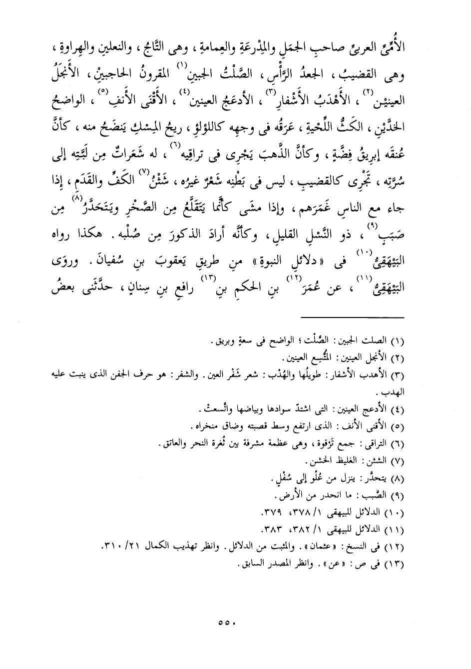 الْأُمِّيِّ الْعَرَبِيِّ، صَاحِبِ الْجَمَلِ وَالْمِدْرَعَةِ وَالْعِمَامَةِ وَهِيَ التَّاجُ وَالنَّعْلَيْنِ وَالْهِرَاوَةِ وَهِيَ الْقَضِيبُ، الْجَعْدُ الرَّأْسِ الصَّلْتُ الْجَبِينِ الْمَقْرُونُ الْحَاجِبَيْنِ الْأَنْجَلُ الْعَيْنَيْنِ الْأَهْدَبُ الْأَشْفَارِ الْأَدْعَجُ الْعَيْنَيْنِ الْأَقْنَى الْأَنْفِ الْوَاضِحُ الْخَدَّيْنِ الْكَثُّ اللِّحْيَةِ، عَرَقُهُ فِي وَجْهِهِ كَاللُّؤْلُؤِ رِيحُ الْمِسْكِ يَنْضَحُ مِنْهُ، كَأَنَّ عُنُقَهُ إِبْرِيقُ فِضَّةٍ وَكَأَنَّ الذَّهَبَ يَجْرِي فِي تَرَاقِيهِ، لَهُ شَعَرَاتٌ مِنْ لَبَّتِهِ إِلَى سُرَّتِهِ تَجْرِي كَالْقَضِيبِ لَيْسَ فِي بَطْنِهِ شَعْرٌ غَيْرُهُ، شَثْنُ الْكَفِّ وَالْقَدَمِ، إِذَا جَاءَ مَعَ النَّاسِ غَمَرَهُمْ، وَإِذَا مَشَى كَأَنَّمَا يَتَقَلَّعُ مِنَ الصَّخْرِ وَيَتَحَدَّرُ مِنْ صَبَبٍ، ذُو النَّسْلِ الْقَلِيلِ. وَكَأَنَّهُ أَرَادَ الذُّكُورَ مِنْ صُلْبِهِ. هَكَذَا رَوَاهُ الْبَيْهَقِيُّ فِي دَلَائِلِ النُّبُوَّةِ مِنْ طَرِيقِ يَعْقُوبَ بْنِ سُفْيَانَ، وَرَوَى الْبَيْهَقِيُّ عَنْ عُمَرَ بْنِ الْحَكَمِ بْنِ رَافِعِ بْنِ سِنَانٍ حَدَّثَنِي بَعْضُ