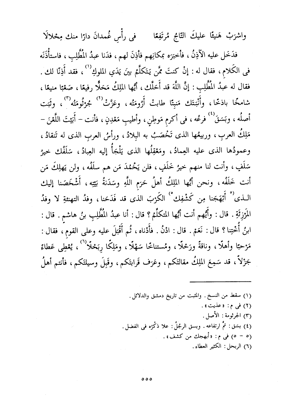 فَدَخَلَ عَلَيْهِ الْآذِنُ فَأَخْبَرَهُ بِمَكَانِهِمْ فَأَذِنَ لَهُمْ فَدَنَا عَبْدُ الْمُطَّلِبِ فَاسْتَأْذَنَهُ فِي الْكَلَامِ فَقَالَ لَهُ: إِنْ كُنْتَ مِمَّنْ يَتَكَلَّمُ بَيْنَ يَدَيِ الْمُلُوكِ فَقَدْ أَذِنَّا لَكَ. فَقَالَ لَهُ عَبْدُ الْمُطَّلِبِ: إِنَّ اللَّهَ قَدْ أَحَلَّكَ أَيُّهَا الْمَلِكُ مَحَلًّا رَفِيعًا صَعْبًا مَنِيعًا شَامِخًا بَاذِخًا، وَأَنْبَتَكَ مَنْبَتًا طَابَتْ أَرُومَتُهُ، وَعَزَّتْ جُرْثُومَتُهُ، وَثَبَتَ أَصْلُهُ، وَبَسَقَ فَرْعُهُ، فِي أَكْرَمِ مَوْطِنٍ وَأَطْيَبِ مَعْدِنٍ فَأَنْتَ - أَبَيْتَ اللَّعْنَ - مَلِكُ الْعَرَبِ، وَرَبِيعُهَا الَّذِي تَخْصَبُ بِهِ الْبِلَادُ، وَرَأْسُ الْعَرَبِ الَّذِي لَهُ تَنْقَادُ، وَعَمُودُهَا الَّذِي عَلَيْهِ الْعِمَادُ، وَمَعْقِلُهَا الَّذِي يَلْجَأُ إِلَيْهِ الْعِبَادُ، وَسَلَفُكَ خَيْرُ سَلَفٍ، وَأَنْتَ لَنَا مِنْهُمْ خَيْرُ خَلَفٍ فَلَنْ يَخْمُدَ مَنْ هُمْ سَلَفُهُ، وَلَنْ يَهْلِكَ مَنْ أَنْتَ خَلَفُهُ، وَنَحْنُ أَيُّهَا الْمَلِكُ أَهْلُ حَرَمِ اللَّهِ، وَسَدَنَةُ بَيْتِهِ أَشْخَصَنَا إِلَيْكَ الَّذِي أَبْهَجَنَا مِنْ كَشْفِكَ الْكَرْبَ الَّذِي قَدْ فَدَحَنَا، وَفْدُ التَّهْنِئَةِ لَا وَفْدُ الْمَرْزِئَةِ. قَالَ: وَأَيُّهُمْ أَنْتَ أَيُّهَا الْمُتَكَلِّمُ؟ قَالَ: أَنَا عَبْدُ الْمُطَّلِبِ بْنُ هَاشِمٍ. قَالَ: ابْنُ أُخْتِنَا؟ قَالَ: نَعَمْ. قَالَ: ادْنُ. فَأَدْنَاهُ ثُمَّ أَقْبَلَ عَلَيْهِ وَعَلَى الْقَوْمِ فَقَالَ: مَرْحَبًا وَأَهْلًا وَنَاقَةً وَرَحْلًا وَمُسْتَنَاخًا سَهْلًا، وَمَلِكًا رِبَحْلًا يُعْطِي عَطَاءً جَزْلًا، قَدْ سَمِعَ الْمَلِكُ مَقَالَتَكُمْ، وَعَرَفَ قَرَابَتَكُمْ وَقَبِلَ وَسِيلَتَكُمْ فَأَنْتُمْ أَهْلُ