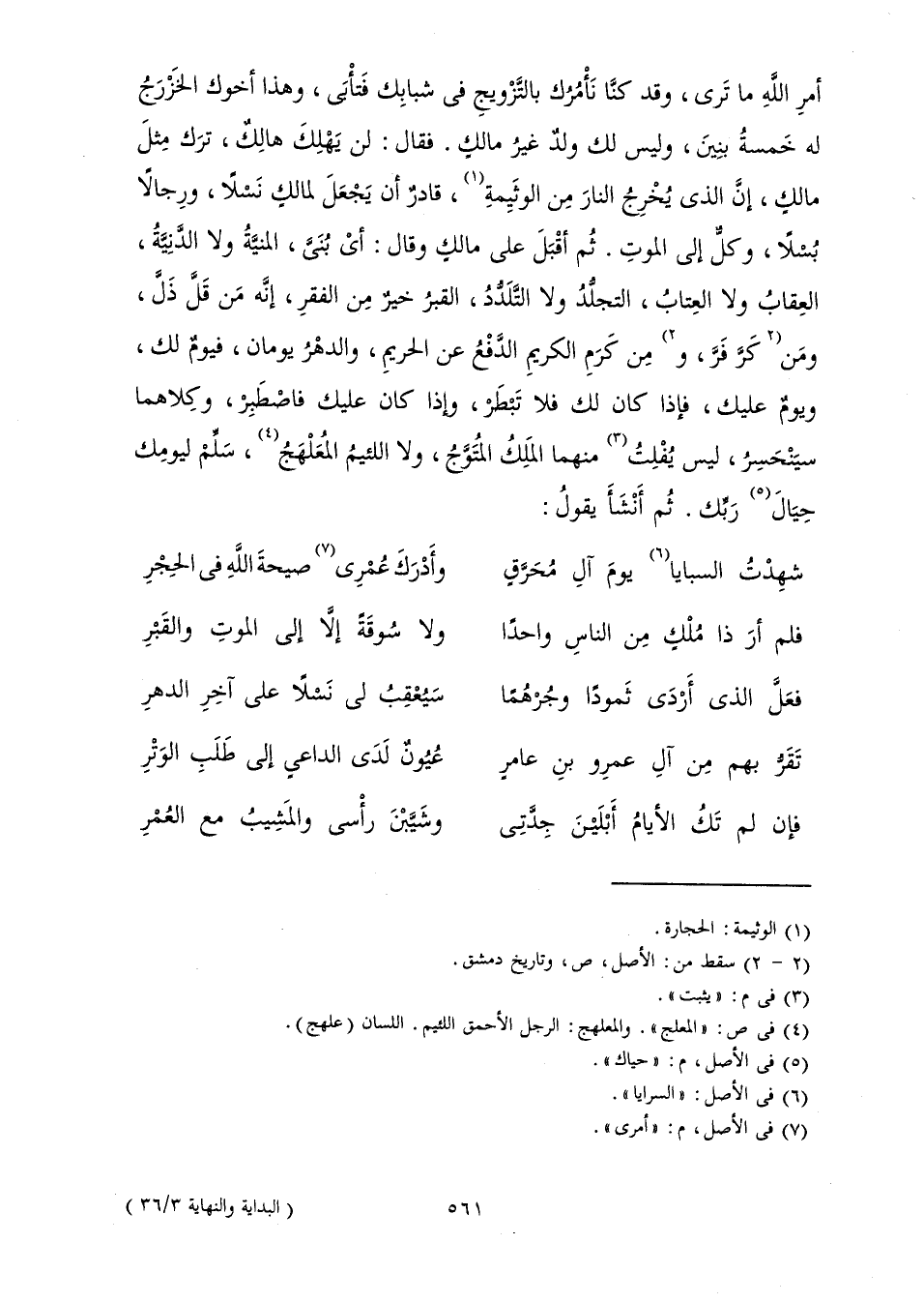 أَمْرِ اللَّهِ مَا تَرَى، وَكُنَّا نَأْمُرُكَ بِالتَّزَوُّجِ فِي شَبَابِكَ فَتَأْبَى. وَهَذَا أَخُوكَ الْخَزْرَجُ لَهُ خَمْسَةُ بَنِينَ، وَلَيْسَ لَكَ وَلَدٌ غَيْرَ مَالِكٍ فَقَالَ: لَنْ يَهْلَكَ هَالِكٌ تَرَكَ مِثْلَ مَالِكٍ إِنَّ الَّذِي يُخْرِجُ النَّارَ مِنَ الْوَثِيمَةِ، قَادِرٌ أَنْ يَجْعَلَ لِمَالِكٍ نَسْلًا وَرِجَالًا بُسْلًا، وَكُلٌّ إِلَى الْمَوْتِ. ثُمَّ أَقْبَلَ عَلَى مَالِكٍ، وَقَالَ: أَيْ بُنَيَّ الْمَنِيَّةُ وَلَا الدَّنِيَّةُ، الْعِقَابُ وَلَا الْعِتَابُ، التَّجَلُّدُ وَلَا التَّلَدُّدُ، الْقَبْرُ خَيْرٌ مِنَ الْفَقْرِ، إِنَّهُ مَنْ قَلَّ ذَلَّ، وَمَنْ كَرَّ فَرَّ، وَمِنْ كَرَمِ الْكَرِيمِ الدَّفْعُ عَنِ الْحَرِيمِ وَالدَّهْرُ يَوْمَانِ; فَيَوْمٌ لَكَ وَيَوْمٌ عَلَيْكَ، فَإِذَا كَانَ لَكَ فَلَا تَبْطَرْ، وَإِذَا كَانَ عَلَيْكَ فَاصْطَبِرْ، وَكُلَاهُمَا سَيَنْحَسِرُ لَيْسَ يُفْلِتُ مِنْهُمَا الْمَلِكُ الْمُتَوَّجُ وَلَا اللَّئِيمُ الْمُعَلْهَجُ، سَلِّمْ لِيَوْمِكَ حِيَالَ رَبِّكَ. ثُمَّ أَنْشَأَ يَقُولُ: