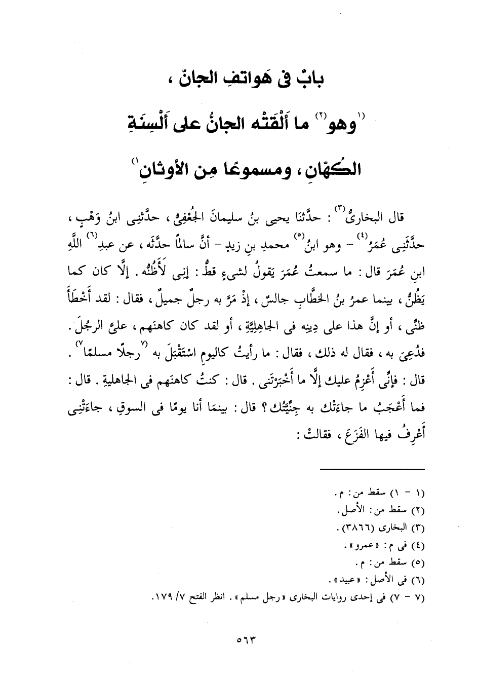 وَقَالَ الْبُخَارِيُّ: حَدَّثَنَا يَحْيَى بْنُ سُلَيْمَانَ الْجُعْفِيُّ حَدَّثَنِي ابْنُ وَهْبٍ حَدَّثَنِي عُمَرُ - هُوَ مُحَمَّدُ بْنُ زَيْدٍ - أَنَّ سَالِمًا حَدَّثَهُ عَنْ عَبْدِ اللَّهِ بْنِ عُمَرَ قَالَ: مَا سَمِعْتُ عُمَرَ يَقُولُ لِشَيْءٍ قَطُّ: إِنِّي لَأَظُنُّهُ. إِلَّا كَانَ كَمَا يَظُنُّ، بَيْنَمَا عُمَرُ بْنُ الْخَطَّابِ جَالِسٌ إِذْ مَرَّ بِهِ رَجُلٌ جَمِيلٌ فَقَالَ: لَقَدْ أَخْطَأَ ظَنِّي، أَوْ إِنَّ هَذَا عَلَى دِينِهِ فِي الْجَاهِلِيَّةِ، أَوْ لَقَدْ كَانَ كَاهِنَهُمْ، عَلَيَّ الرَّجُلَ. فَدُعِيَ بِهِ فَقَالَ لَهُ ذَلِكَ فَقَالَ: مَا رَأَيْتُ كَالْيَوْمِ اسْتَقْبَلَ بِهِ رَجُلًا مُسْلِمًا. قَالَ: فَإِنِّي أَعْزِمُ عَلَيْكَ إِلَّا مَا أَخْبَرْتَنِي. قَالَ: كُنْتُ كَاهِنَهُمْ فِي الْجَاهِلِيَّةِ. قَالَ: فَمَا أَعْجَبُ مَا جَاءَتْكَ بِهِ جِنِّيَّتُكَ؟ قَالَ: بَيْنَمَا أَنَا فِي السُّوقِ يَوْمًا جَاءَتْنِي أَعْرِفُ فِيهَا الْفَزَعَ فَقَالَتْ