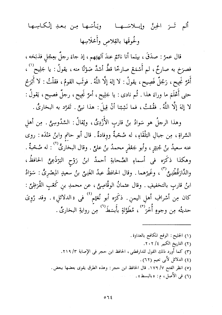 وَهَذَا الرَّجُلُ هُوَ سَوَادُ بْنُ قَارِبٍ الْأَزْدِيُّ، وَيُقَالُ: السَّدُوسِيُّ مِنْ أَهْلِ السَّرَاةِ مِنْ جِبَالِ الْبَلْقَاءِ لَهُ صُحْبَةٌ، وَوِفَادَةٌ قَالَ أَبُو حَاتِمٍ، وَابْنُ مَنْدَهْ: رَوَى عَنْهُ سَعِيدُ بْنُ جُبَيْرٍ، وَأَبُو جَعْفَرٍ مُحَمَّدُ بْنُ عَلِيٍّ، وَقَالَ الْبُخَارِيُّ: لَهُ صُحْبَةٌ، وَهَكَذَا ذَكَرَهُ فِي أَسْمَاءِ الصَّحَابَةِ أَحْمَدُ بْنُ رَوْحٍ الْبَرْذَعِيُّ الْحَافِظُ والدَّارَقُطْنِيُّ وَغَيْرُهُمَا، وَقَالَ الْحَافِظُ عَبْدُ الْغَنِيِّ بْنُ سَعِيدٍ الْمِصْرِيُّ: سَوَادُ بْنُ قَارِبٍ بِالتَّخْفِيفِ، وَقَالَ عُثْمَانُ الْوَقَّاصِيُّ عَنْ مُحَمَّدِ بْنِ كَعْبٍ الْقُرَظِيِّ: كَانَ مِنْ أَشْرَافِ أَهْلِ الْيَمَنِ ذَكَرَهُ أَبُو نُعَيْمٍ فِي الدَّلَائِلِ، وَقَدْ رُوِيَ حَدِيثُهُ مِنْ وُجُوهٍ أُخَرَ مُطَوَّلَةٍ بِأَبْسَطَ مِنْ رِوَايَةِ الْبُخَارِيِّ.