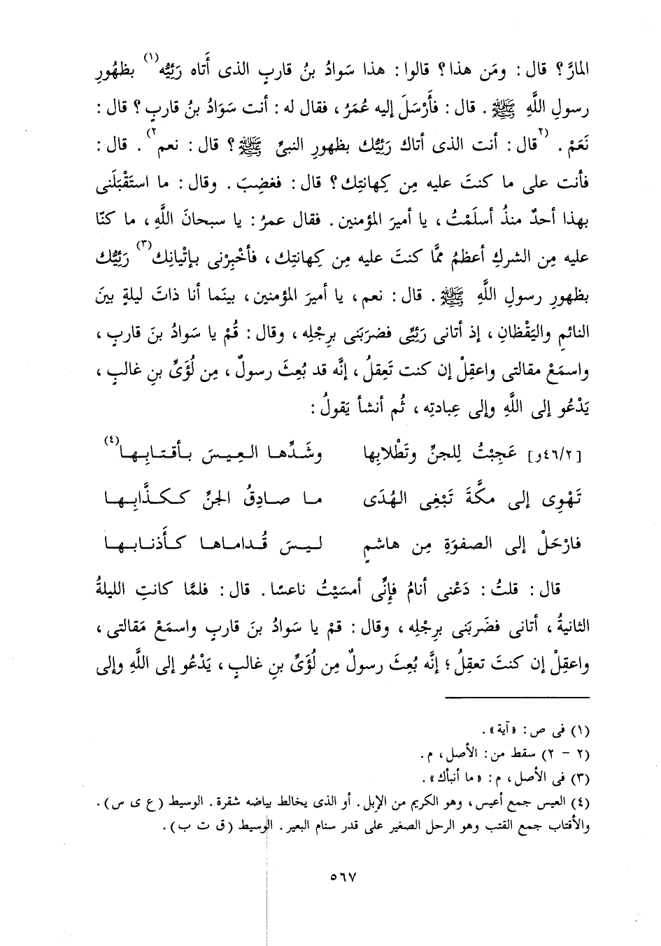 الْمَارَّ؟ قَالَ: وَمَنْ هَذَا؟ قَالُوا: هَذَا سَوَادُ بْنُ قَارِبٍ الَّذِي أَتَاهُ رَئِيُّهُ بِظُهُورِ رَسُولِ اللَّهِ صَلَّى اللَّهُ عَلَيْهِ وَسَلَّمَ قَالَ: فَأَرْسَلَ إِلَيْهِ عُمَرُ فَقَالَ لَهُ: أَنْتَ سَوَادُ بْنُ قَارِبٍ؟ قَالَ: نَعَمْ. قَالَ: فَأَنْتَ عَلَى مَا كُنْتَ عَلَيْهِ مِنْ كَهَانَتِكَ؟ قَالَ: فَغَضِبَ، وَقَالَ: مَا اسْتَقْبَلَنِي بِهَذَا أَحَدٌ مُنْذُ أَسْلَمْتُ يَا أَمِيرَ الْمُؤْمِنِينَ. فَقَالَ عُمَرُ: يَا سُبْحَانَ اللَّهِ مَا كُنَّا عَلَيْهِ مِنَ الشِّرْكِ أَعْظَمُ مِمَّا كُنْتَ عَلَيْهِ مِنْ كَهَانَتِكَ فَأَخْبِرْنِي بِإِتْيَانِكَ رَئِيُّكَ بِظُهُورِ رَسُولِ اللَّهِ صَلَّى اللَّهُ عَلَيْهِ وَسَلَّمَ. قَالَ: نَعَمْ يَا أَمِيرَ الْمُؤْمِنِينَ، بَيْنَمَا أَنَا ذَاتَ لَيْلَةٍ بَيْنَ النَّائِمِ وَالْيَقْظَانِ، إِذْ أَتَانِي رَئِيِّي فَضَرَبَنِي بِرِجْلِهِ، وَقَالَ: قُمْ يَا سَوَادُ بْنَ قَارِبٍ وَاسْمَعْ مَقَالَتِي، وَاعْقِلْ إِنْ كُنْتَ تَعْقِلُ إِنَّهُ قَدْ بُعِثَ رَسُولٌ مِنْ لُؤَيِّ بْنِ غَالِبٍ، يَدْعُو إِلَى اللَّهِ وَإِلَى عِبَادَتِهِ، ثُمَّ أَنْشَأَ يَقُولُ