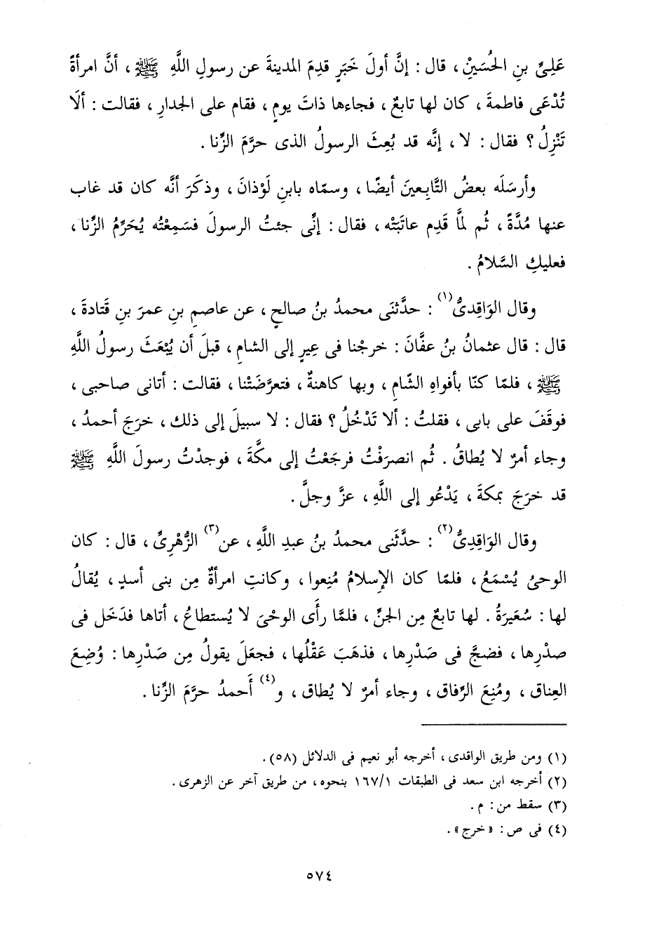عَلِيِّ بْنِ الْحُسَيْنِ قَالَ: إِنَّ أَوَّلَ خَبَرٍ قَدِمَ الْمَدِينَةَ عَنْ رَسُولِ اللَّهِ صَلَّى اللَّهُ عَلَيْهِ وَسَلَّمَ، أَنَّ امْرَأَةً تُدْعَى فَاطِمَةَ كَانَ لَهَا تَابِعٌ فَجَاءَهَا ذَاتَ يَوْمٍ فَقَامَ عَلَى الْجِدَارِ فَقَالَتْ: أَلَا تَنْزِلُ؟ فَقَالَ: لَا إِنَّهُ قَدْ بُعِثَ الرَّسُولُ الَّذِي حَرَّمَ الزِّنَا.