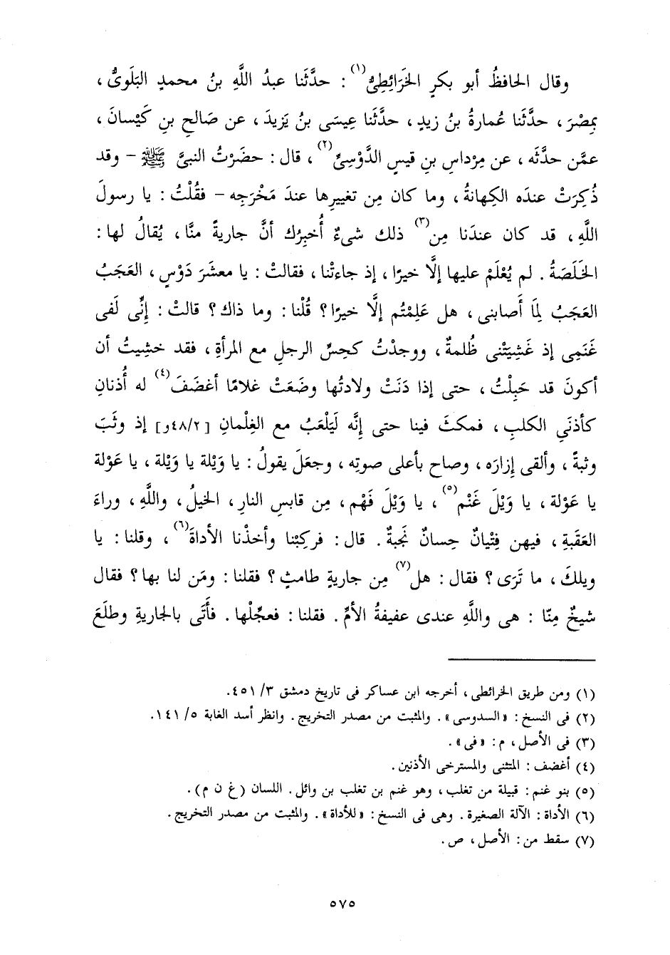 وَقَالَ الْحَافِظُ أَبُو بَكْرٍ الْخَرَائِطِيُّ: حَدَّثَنَا عَبْدُ اللَّهِ بْنُ مُحَمَّدٍ الْبَلَوِيُّ بِمِصْرَ حَدَّثَنَا عُمَارَةُ بْنُ زَيْدٍ حَدَّثَنَا عِيسَى بْنُ يَزِيدَ عَنْ صَالِحِ بْنِ كَيْسَانَ عَمَّنْ حَدَّثَهُ «عَنْ مِرْدَاسِ بْنِ قَيْسٍ السَّدُوسِيِّ قَالَ: حَضَرْتُ النَّبِيَّ صَلَّى اللَّهُ عَلَيْهِ وَسَلَّمَ - وَقَدْ ذُكِرَتْ عِنْدَهُ الْكِهَانَةُ، وَمَا كَانَ مِنْ تَغْيِيرِهَا عِنْدَ مَخْرِجِهِ - فَقُلْتُ: يَا رَسُولَ اللَّهِ قَدْ كَانَ عِنْدَنَا فِي ذَلِكَ شَيْءٌ أَخْبِرُكَ أَنَّ جَارِيَةً مِنَّا يُقَالَ لَهَا: الْخَلَصَةُ لَمْ يُعْلَمْ عَلَيْهَا إِلَّا خَيْرًا، إِذَا جَاءَتْنَا فَقَالَتْ: يَا مَعْشَرَ دَوْسٍ، الْعَجَبُ الْعَجَبُ لِمَا أَصَابَنِي هَلْ عَلِمْتُمْ إِلَّا خَيْرًا؟ قُلْنَا: وَمَا ذَاكَ؟ قَالَتْ: إِنِّي لَفِي غَنَمِي إِذْ غَشِيَتْنِي ظُلْمَةٌ، وَوَجَدْتُ كَحِسِّ الرَّجُلِ مَعَ الْمَرْأَةِ، فَقَدْ خَشِيتُ أَنْ أَكُونَ قَدْ حَبِلْتُ، حَتَّى إِذَا دَنَتْ وِلَادَتُهَا، وَضَعَتْ غُلَامًا أَغْضَفَ لَهُ أُذُنَانِ كَأُذُنَيِ الْكَلْبِ فَمَكَثَ فِينَا حَتَّى إِنَّهُ لَيَلْعَبُ مَعَ الْغِلْمَانِ إِذْ وَثَبَ وَثْبَةً وَأَلْقَى إِزَارَهُ، وَصَاحَ بِأَعْلَى صَوْتِهِ، وَجَعَلَ يَقُولُ: يَا وَيْلَةْ يَا وَيْلَةْ، يَا عَوْلَةْ يَا عَوْلَةْ، يَا وَيْلَ غَنْمٍ، يَا وَيْلَ فَهْمٍ مِنْ قَابِسِ النَّارِ، الْخَيْلُ وَاللَّهِ وَرَاءَ الْعَقَبَةِ، فِيهِنَّ فِتْيَانٌ حِسَانٌ نَجِبَةٌ. قَالَ: فَرَكِبْنَا وَأَخَذْنَا الْأَدَاةَ، وَقُلْنَا: يَا وَيْلَكَ مَا تَرَى؟ فَقَالَ: هَلْ مِنْ جَارِيَةٍ طَامِثٍ؟ فَقُلْنَا: وَمَنْ لَنَا بِهَا؟ فَقَالَ شَيْخٌ مِنَّا: هِيَ وَاللَّهِ عِنْدِي عَفِيفَةُ الْأُمِّ. فَقُلْنَا: فَعَجِّلْهَا فَأَتَى بِالْجَارِيَةِ، وَطَلَعَ