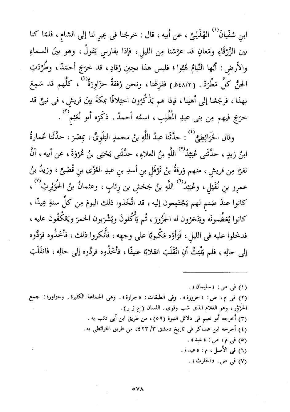 وَقَالَ الْخَرَائِطِيُّ: حَدَّثَنَا عَبْدُ اللَّهِ بْنُ مُحَمَّدٍ الْبَلَوِيُّ بِمِصْرَ حَدَّثَنَا عُمَارَةُ بْنُ زَيْدٍ حَدَّثَنِي عُبَيْدُ اللَّهِ بْنُ الْعَلَاءِ حَدَّثَنِي يَحْيَى بْنُ عُرْوَةَ عَنْ أَبِيهِ أَنَّ نَفَرًا مِنْ قُرَيْشٍ مِنْهُمْ وَرَقَةُ بْنُ نَوْفَلِ بْنِ أَسَدِ بْنِ عَبْدِ الْعُزَّى بْنِ قُصَيٍّ وَزَيْدُ بْنُ عَمْرِو بْنِ نُفَيْلٍ، وَعُبَيْدُ اللَّهِ بْنُ جَحْشِ بْنِ رِئَابٍ، وَعُثْمَانُ بْنُ الْحُوَيْرِثِ، كَانُوا عِنْدَ صَنَمٍ لَهُمْ يَجْتَمِعُونَ إِلَيْهِ قَدِ اتَّخَذُوا ذَلِكَ الْيَوْمَ مِنْ كُلِّ سَنَةٍ عِيدًا كَانُوا يُعَظِّمُونَهُ، وَيَنْحَرُونَ لَهُ الْجَزُورَ، ثُمَّ يَأْكُلُونَ وَيَشْرَبُونَ الْخَمْرَ، وَيَعْكُفُونَ عَلَيْهِ فَدَخَلُوا عَلَيْهِ فِي اللَّيْلِ فَرَأَوْهُ مَكْبُوبًا عَلَى وَجْهِهِ فَأَنْكَرُوا ذَلِكَ فَأَخَذُوهُ فَرَدُّوهُ إِلَى حَالِهِ فَلَمْ يَلْبَثْ أَنِ انْقَلَبَ انْقِلَابًا عَنِيفًا فَأَخَذُوهُ فَرَدُّوهُ إِلَى حَالِهِ فَانْقَلَبَ