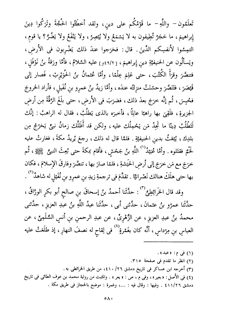 تَعْلَمُونَ - وَاللَّهِ - مَا قَوْمُكُمْ عَلَى دِينٍ، وَلَقَدْ أَخْطَئُوا الْحُجَّةَ، وَتَرَكُوا دِينَ إِبْرَاهِيمَ مَا حَجَرٌ تُطِيفُونَ بِهِ لَا يَسْمَعُ وَلَا يُبْصِرُ وَلَا يَنْفَعُ وَلَا يَضُرُّ؟ يَا قَوْمِ، الْتَمِسُوا لِأَنْفُسِكُمُ الدِّينَ. قَالَ: فَخَرَجُوا عِنْدَ ذَلِكَ يَضْرِبُونَ فِي الْأَرْضِ، وَيَسْأَلُونَ عَنِ الْحَنِيفِيَّةِ دِينِ إِبْرَاهِيمَ عَلَيْهِ السَّلَامُ فَأَمَّا وَرَقَةُ بْنُ نَوْفَلٍ فَتَنَصَّرَ، وَقَرَأَ الْكُتُبَ حَتَّى عَلِمَ عِلْمًا، وَأَمَّا عُثْمَانُ بْنُ الْحُوَيْرِثِ فَسَارَ إِلَى قَيْصَرَ فَتَنَصَّرَ، وَحَسُنَتْ مَنْزِلَتُهُ عِنْدَهُ، وَأَمَّا زَيْدُ بْنُ عَمْرِو بْنِ نُفَيْلٍ فَأَرَادَ الْخُرُوجَ فَحُبِسَ، ثُمَّ إِنَّهُ خَرَجَ بَعْدَ ذَلِكَ فَضَرَبَ فِي الْأَرْضِ حَتَّى بَلَغَ الرِّقَّةَ مِنْ أَرْضِ الْجَزِيرَةِ فَلَقِيَ بِهَا رَاهِبًا عَالِمًا فَأَخْبَرَهُ بِالَّذِي يَطْلُبُ فَقَالَ لَهُ الرَّاهِبُ: إِنَّكَ لَتَطْلُبُ دِينًا مَا تَجِدُ مَنْ يَحْمِلُكَ عَلَيْهِ، وَلَكِنْ قَدْ أَظَلَّكَ زَمَانُ نَبِيٍّ يَخْرُجُ مِنْ بَلَدِكَ يُبْعَثُ بِدِينِ الْحَنِيفِيَّةِ فَلَمَّا قَالَ لَهُ ذَلِكَ رَجَعَ يُرِيدُ مَكَّةَ فَغَارَتْ عَلَيْهِ لَخْمٌ فَقَتَلُوهُ، وَأَمَّا عُبَيْدُ اللَّهِ بْنُ جَحْشٍ فَأَقَامَ بِمَكَّةَ حَتَّى بُعِثَ النَّبِيُّ صَلَّى اللَّهُ عَلَيْهِ وَسَلَّمَ، ثُمَّ خَرَجَ مَعَ مَنْ خَرَجَ إِلَى أَرْضِ الْحَبَشَةِ فَلَمَّا صَارَ بِهَا تَنَصَّرَ، وَفَارَقَ الْإِسْلَامَ فَكَانَ بِهَا حَتَّى هَلَكَ هُنَالِكَ نَصْرَانِيًّا، تَقَدَّمَ فِي تَرْجَمَةِ زَيْدِ بْنِ عَمْرِو بْنِ نُفَيْلٍ لَهُ شَاهِدٌ.