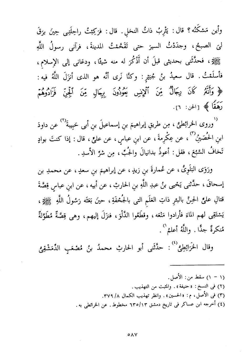وَأَيْنَ مَسْكَنُهُ؟ قَالَ: يَثْرِبُ ذَاتُ النَّخْلِ قَالَ: فَرَكِبْتُ رَاحِلَتِي حِينَ بَرَقَ لِيَ الصُّبْحُ وَجَدَدْتُ السَّيْرَ حَتَّى تَقَحَّمْتُ الْمَدِينَةَ فَرَآنِي رَسُولُ اللَّهِ صَلَّى اللَّهُ عَلَيْهِ وَسَلَّمَ فَحَدَّثَنِي بِحَدِيثِي قَبْلَ أَنْ أَذْكُرَ لَهُ مِنْهُ شَيْئًا، وَدَعَانِي إِلَى الْإِسْلَامِ فَأَسْلَمْتُ قَالَ سَعِيدُ بْنُ جُبَيْرٍ، وَكُنَّا نَرَى أَنَّهُ هُوَ الَّذِي أَنْزَلَ اللَّهُ فِيهِ {وَأَنَّهُ كَانَ رِجَالٌ مِنَ الْإِنْسِ يَعُوذُونَ بِرِجَالٍ مِنَ الْجِنِّ فَزَادُوهُمْ رَهَقًا} [الجن: 6] .