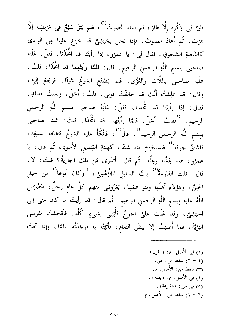 طَيْرٌ فِي وَكْرِهِ إِلَّا طَارَ، ثُمَّ أَعَادَ الصَّوْتَ فَلَمْ يَبْقَ سَبْعٌ فِي مَرْبِضِهِ إِلَّا هَرَبَ، ثُمَّ أَعَادَ الصَّوْتَ فَإِذَا نَحْنُ بِحَبَشِيٍّ قَدْ خَرَجَ عَلَيْنَا مِنَ الْوَادِي كَالنَّخْلَةِ السَّحُوقِ، فَقَالَ لِي: يَا عَمْرُو إِذْ رَأَيْتَنَا قَدِ اتَّحَدْنَا فَقُلْ: غَلَبَهُ صَاحِبِي بِبِسْمِ اللَّهِ الرَّحْمَنِ الرَّحِيمِ. قَالَ: فَلَمَّا رَأَيْتُهُمَا قَدِ اتَّحَدَا قُلْتُ: غَلَبَهُ صَاحِبِي بِاللَّاتِ وَالْعُزَّى فَلَمْ يَصْنَعِ الشَّيْخُ شَيْئًا فَرَجَعَ إِلَيَّ وَقَالَ: قَدْ عَلِمْتُ أَنَّكَ قَدْ خَالَفْتَ قَوْلِي. قُلْتُ أَجَلْ وَلَسْتُ بِعَائِدٍ. فَقَالَ: إِذَا رَأَيْتَنَا قَدِ اتَّحَدْنَا فَقُلْ: غَلَبَهُ صَاحِبِي بِبِسْمِ اللَّهِ الرَّحْمَنِ الرَّحِيمِ فَقُلْتُ: أَجَلْ فَلَمَّا رَأَيْتُهُمَا قَدِ اتَّحَدَا قُلْتُ: غَلَبَهُ صَاحِبِي بِبِسْمِ اللَّهِ الرَّحْمَنِ الرَّحِيمِ قَالَ: فَاتَّكَأَ عَلَيْهِ الشَّيْخُ فَبَعَجَهُ بِسَيْفِهِ فَاشْتَقَّ جَوْفَهُ فَاسْتَخْرَجَ مِنْهُ شَيْئًا كَهَيْئَةِ الْقِنْدِيلِ الْأَسْوَدِ، ثُمَّ قَالَ: يَا عَمْرُو هَذَا غِشُّهُ وَغِلُّهُ، ثُمَّ قَالَ: أَتَدْرِي مَنْ تِلْكَ الْجَارِيَةُ؟ قُلْتُ: لَا. قَالَ: تِلْكَ الْفَارِعَةُ بِنْتُ السَّلِيلِ الْجُرْهُمِيِّ، وَكَانَ أَبُوهَا مِنْ خِيَارِ الْجِنِّ، وَهَؤُلَاءِ أَهْلُهَا، وَبَنُو عَمِّهَا يَغْزُونِي مِنْهُمْ كُلَّ عَامٍ رَجُلٌ، يَنْصُرُنِي اللَّهُ عَلَيْهِ بِبِسْمِ اللَّهِ الرَّحْمَنِ الرَّحِيمِ، ثُمَّ قَالَ: قَدْ رَأَيْتَ مَا كَانَ مِنِّي إِلَى الْحَبَشِيِّ وَقَدْ غَلَبَ عَلَيَّ الْجُوعُ فَائْتِنِي بِشَيْءٍ آكُلُهُ.