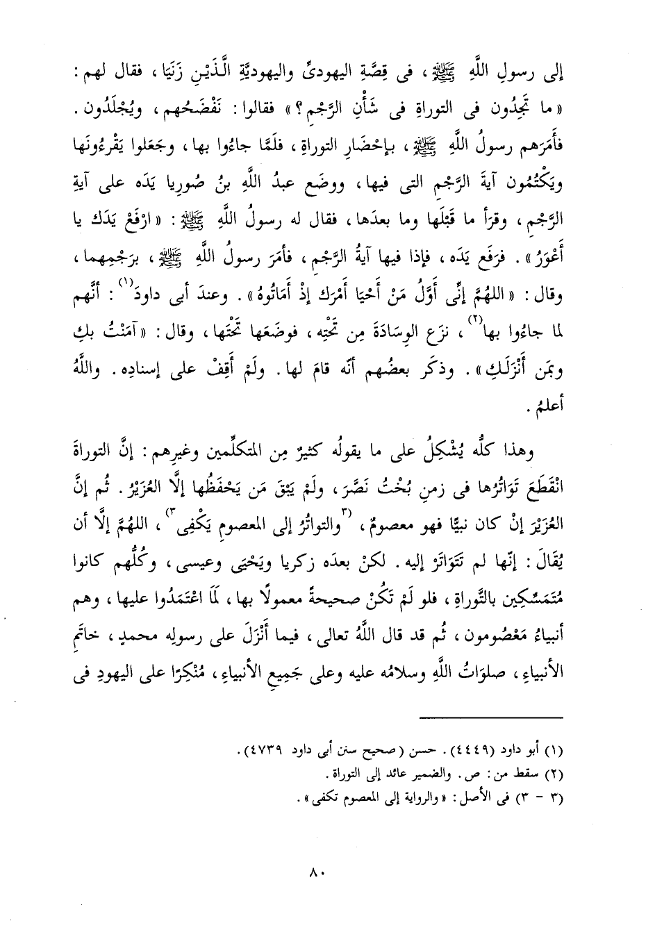 إِلَى رَسُولِ اللَّهِ صَلَّى اللَّهُ عَلَيْهِ وَسَلَّمَ فِي قِصَّةِ الْيَهُودِيِّ وَالْيَهُودِيَّةِ اللَّذَيْنِ زَنَيَا فَقَالَ لَهُمْ: " مَا تَجِدُونَ فِي التَّوْرَاةِ فِي شَأْنِ الرَّجْمِ؟ " فَقَالُوا: نَفْضَحُهُمْ وَيُجْلَدُونَ، فَأَمَرَهُمْ رَسُولُ اللَّهِ صَلَّى اللَّهُ عَلَيْهِ وَسَلَّمَ بِإِحْضَارِ التَّوْرَاةِ فَلَمَّا جَاءُوا بِهَا وَجَعَلُوا يَقْرَءُونَهَا وَيَكْتُمُونَ آيَةَ الرَّجْمِ الَّتِي فِيهَا، وَوَضَعَ عَبْدُ اللَّهِ بْنُ صُورِيَا يَدَهُ عَلَى آيَةِ الرَّجْمِ، وَقَرَأَ مَا قَبْلَهَا وَمَا بَعْدَهَا فَقَالَ لَهُ رَسُولُ اللَّهِ صَلَّى اللَّهُ عَلَيْهِ وَسَلَّمَ: " ارْفَعْ يَدَكَ يَا أَعْوَرُ " فَرَفَعَ يَدَهُ فَاذَا فِيهَا آيَةُ الرَّجْمِ فَأَمَرَ رَسُولُ اللَّهِ صَلَّى اللَّهُ عَلَيْهِ وَسَلَّمَ بِرَجْمِهِمَا، وَقَالَ: " اللَّهُمَّ إِنِّي أَوَّلُ مَنْ أَحْيَا أَمْرَكَ إِذْ أَمَاتُوهُ» ". وَعِنْدَ أَبِي دَاوُدَ أَنَّهُمْ لَمَّا جَاءُوا بِهَا نَزَعَ الْوِسَادَةَ مِنْ تَحْتِهِ فَوَضَعَهَا تَحْتَهَا، وَقَالَ: آمَنْتُ بِكِ وَبِمَنْ أَنْزَلَكِ. وَذَكَرَ بَعْضُهُمْ أَنَّهُ قَامَ لَهَا. وَلَمْ أَقِفْ عَلَى إِسْنَادِهِ. وَاللَّهُ أَعْلَمُ.