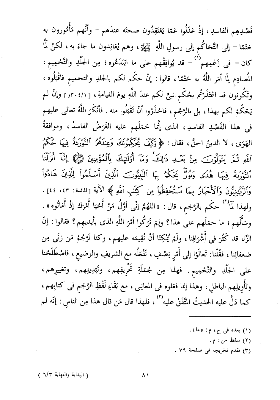 [الْمَائِدَةِ: 43، 44] الْآيَةَ. وَلِهَذَا لَمَّا حَكَمَ بِالرَّجْمِ قَالَ: " «اللَّهُمَّ إِنِّي أَوَّلُ مَنْ أَحْيَا أَمْرَكَ إِذْ أَمَاتُوهُ " وَسَأَلَهُمْ مَا حَمَلَهُمْ عَلَى هَذَا؟ وَلِمَ تَرَكُوا أَمْرَ اللَّهِ الَّذِي بِأَيْدِيهِمْ؟ فَقَالُوا: إِنَّ الزِّنَا قَدْ كَثُرَ فِي أَشْرَافِنَا، وَلَمْ يُمْكِنَّا أَنْ نُقِيمَهُ عَلَيْهِمْ، وَكُنَّا نَرْجُمُ مَنْ زَنَى مِنْ ضُعَفَائِنَا فَقُلْنَا: تَعَالَوْا إِلَى أَمْرٍ نِصْفٍ نَفْعَلُهُ مَعَ الشَّرِيفِ وَالْوَضِيعِ فَاصْطَلَحْنَا عَلَى الْجَلْدِ وَالتَّحْمِيمِ» فَهَذَا مِنْ جُمْلَةِ تَحْرِيفِهِمْ وَتَبْدِيلِهِمْ وَتَغْيِيرِهِمْ وَتَأْوِيلِهِمُ الْبَاطِلِ. وَهَذَا إِنَّمَا فَعَلُوهُ فِي الْمَعَانِي، مَعَ بَقَاءِ لَفْظِ الرَّجْمِ فِي كِتَابِهِمْ، كَمَا دَلَّ عَلَيْهِ الْحَدِيثُ الْمُتَّفَقُ عَلَيْهِ.