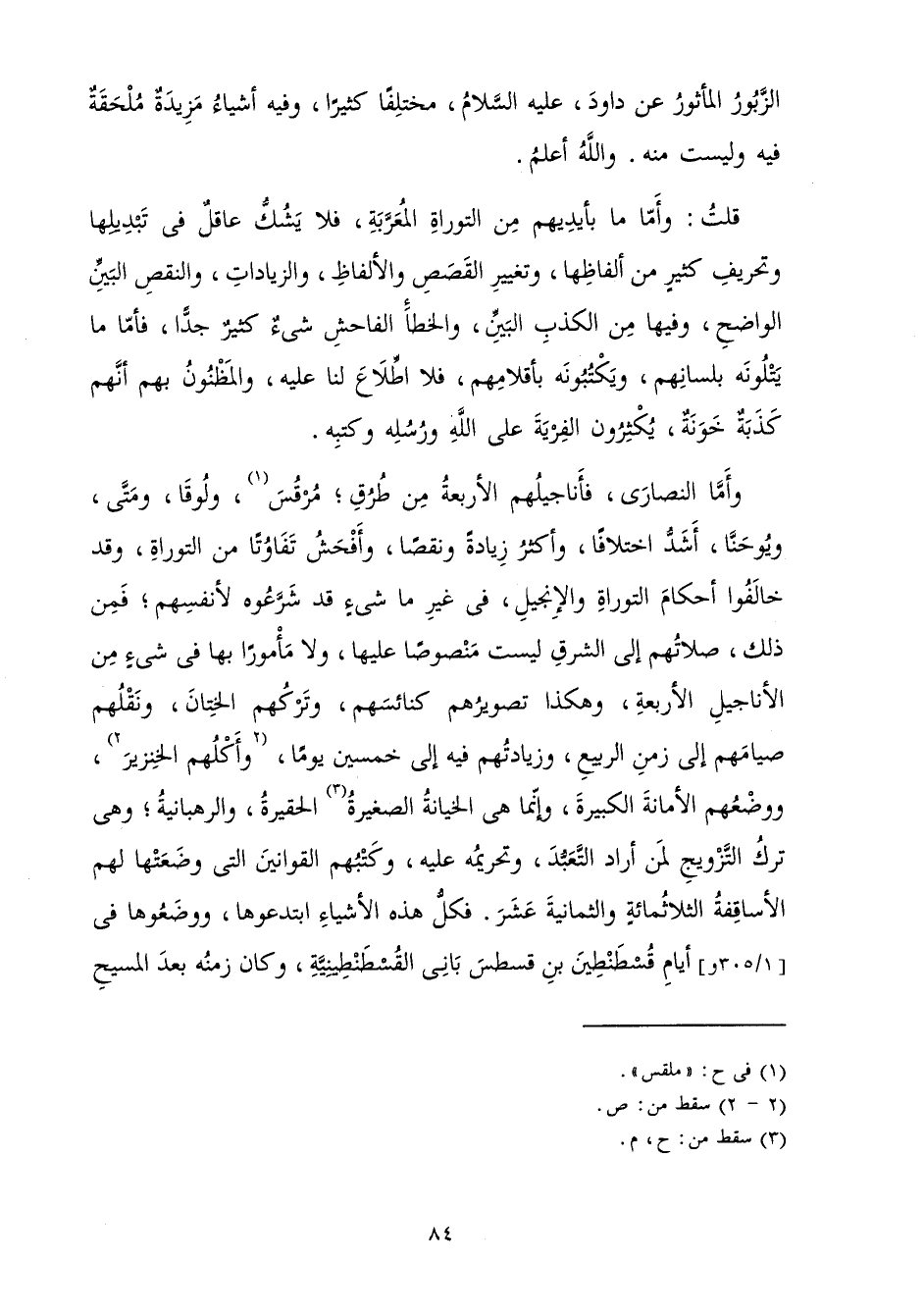 وَأَمَّا النَّصَارَى فَأَنَاجِيلُهُمُ الْأَرْبَعَةُ مِنْ طُرُقِ مُرْقُسٍ وَلُوقَا وَمَتَّى وَيُوحَنَّا، أَشَدُّ اخْتِلَافًا وَأَكْثَرُ زِيَادَةً وَنَقْصًا وَأَفْحَشُ تَفَاوُتًا مِنَ التَّوْرَاةِ وَقَدْ خَالَفُوا أَحْكَامَ التَّوْرَاةِ وَالْإِنْجِيلِ فِي غَيْرِ مَا شَيْءٍ قَدْ شَرَعُوهُ لِأَنْفُسِهِمْ، فَمِنْ ذَلِكَ صَلَاتُهُمْ إِلَى الشَّرْقِ، وَلَيْسَتْ مَنْصُوصًا عَلَيْهَا وَلَا مَأْمُورًا بِهَا فِي شَيْءٍ مِنَ الْأَنَاجِيلِ الْأَرْبَعَةِ، وَهَكَذَا تَصْوِيرُهُمْ كَنَائِسَهُمْ، وَتَرْكُهُمُ الْخِتَانَ، وَنَقْلُهُمْ صِيَامَهُمْ إِلَى زَمَنِ الرَّبِيعِ، وَزِيَادَتُهُ فِيهِ إِلَى خَمْسِينَ يَوْمًا، وَأَكَلُهُمُ الْخِنْزِيرَ، وَوَضْعُهُمُ الْأَمَانَةَ الْكَبِيرَةَ، وَإِنَّمَا هِيَ الْخِيَانَةُ الصَّغِيرَةُ الْحَقِيرَةُ، وَالرَّهْبَانِيَّةُ، وَهِيَ تَرْكُ التَّزْوِيجِ لِمَنْ أَرَادَ التَّعَبُّدَ، وَتَحْرِيمَهُ عَلَيْهِ، وَكَتْبُهُمُ الْقَوَانِينَ الَّتِي وَضَعَتْهَا لَهُمُ الْأَسَاقِفَةُ الثَّلَاثُمِائَةِ وَالثَّمَانِيَةَ عَشَرَ.