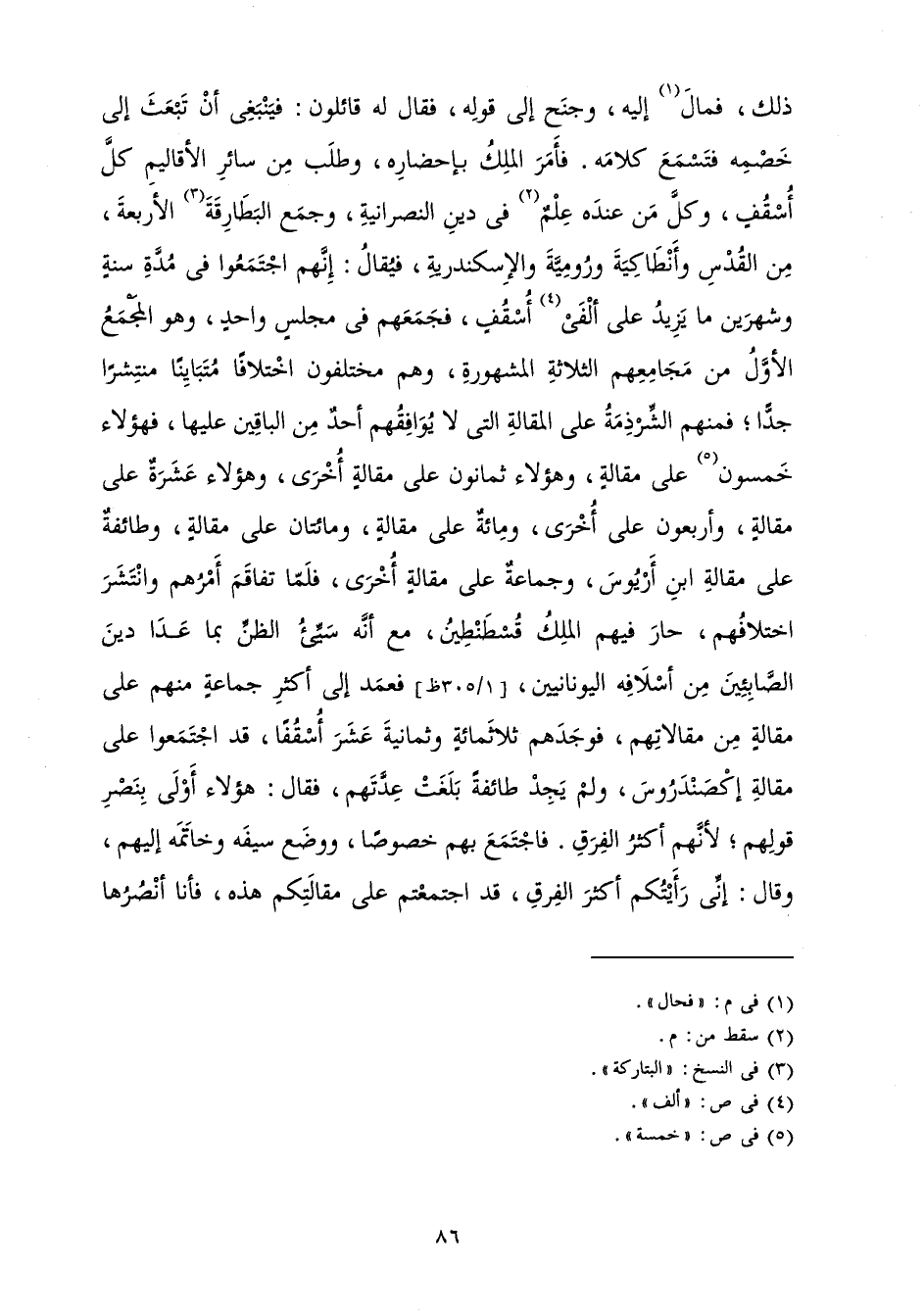 ذَلِكَ فَمَالَ إِلَيْهِ، وَجَنَحَ إِلَى قَوْلِهِ فَقَالَ لَهُ قَائِلُونَ: فَيَنْبَغِي أَنْ تَبْعَثَ إِلَى خَصْمِهِ فَتَسْمَعُ كَلَامَهُ فَأَمَرَ الْمَلِكُ بِإِحْضَارِهِ، وَطَلَبَ مِنْ سَائِرِ الْأَقَالِيمِ كُلَّ أُسْقُفٍ، وَكُلَّ مَنْ عِنْدَهُ عِلْمٌ فِي دِينِ النَّصْرَانِيَّةِ، وَجَمَعَ الْبَطَارِقَةَ الْأَرْبَعَةَ مِنَ الْقُدْسِ، وَأَنْطَاكِيَةَ وَرُومِيَّةَ وَالْإِسْكَنْدَرِيَّةَ فَيُقَالَ: إِنَّهُمُ اجْتَمَعُوا فِي مُدَّةِ سَنَةٍ وَشَهْرَيْنِ مَا يَزِيدُ عَلَى أَلْفَيْ أُسْقُفٍ.