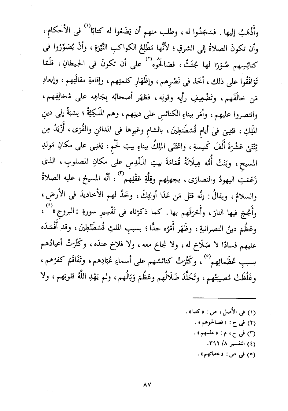 وَعَظُمَ دِينُ النَّصْرَانِيَّةِ، وَظَهَرَ أَمْرُهُ جِدًّا بِسَبَبِ الْمَلِكِ قُسْطَنْطِينَ وَقَدْ أَفْسَدَهُ عَلَيْهِمْ فَسَادًا لَا صَلَاحَ لَهُ وَلَا نَجَاحَ مَعَهُ وَلَا فَلَاحَ عِنْدِهِ، وَكَثُرَتْ أَعْيَادُهُمْ بِسَبَبِ عُظَمَائِهِمْ، وَكَثُرَتْ كَنَائِسُهُمْ عَلَى أَسْمَاءِ عُبَّادِهِمْ، وَتَفَاقَمَ كُفْرُهُمْ، وَغَلُظَتْ مُصِيبَتُهُمْ، وَتَخَلَّدَ ضَلَالُهُمْ، وَعَظُمَ وَبَالُهُمْ، وَلَمْ يَهْدِ اللَّهُ قُلُوبَهُمْ وَلَا