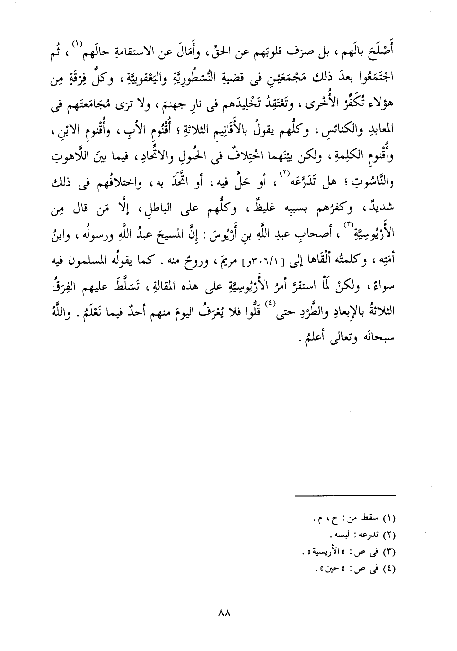 أَصْلَحَ بَالَهُمْ بَلْ صَرَفَ قُلُوبَهُمْ عَنِ الْحَقِّ، وَأَمَالَ عَنِ الِاسْتِقَامَةِ حَالَهُمْ، ثُمَّ اجْتَمَعُوا بَعْدَ ذَلِكَ مَجْمَعَيْنِ فِي قَضِيَّةِ النُّسْطُورِيَّةِ وَالْيَعْقُوبِيَّةِ، وَكُلُّ فِرْقَةٍ مِنْ هَؤُلَاءِ تُكَفِّرُ الْأُخْرَى، وَتَعْتَقِدُ تَخْلِيدَهُمْ فِي نَارِ جَهَنَّمَ وَلَا تَرَى مُجَامَعَتَهُمْ فِي الْمَعَابِدِ وَالْكَنَائِسِ، وَكُلُّهُمْ يَقُولُ بِالْأَقَانِيمِ الثَّلَاثَةِ: أُقْنُومِ الْأَبِ، وَأُقْنُومِ الِابْنِ، وَأُقْنُومِ الْكَلِمَةِ، وَلَكِنْ بَيْنَهُمُ اخْتِلَافٌ فِي الْحُلُولِ وَالِاتِّحَادِ فِيمَا بَيْنُ اللَّاهُوتِ وَالنَّاسُوتِ هَلْ تَدَرَّعَهُ أَوْ حَلَّ فِيهِ أَوِ اتَّحَدَ بِهِ، وَاخْتِلَافُهُمْ فِي ذَلِكَ شَدِيدٌ، وَكُفْرُهُمْ بِسَبَبِهِ غَلِيظٌ، وَكُلُّهُمْ عَلَى الْبَاطِلِ إِلَّا مَنْ قَالَ مِنَ الْأَرْيُوسِيَّةِ أَصْحَابِ عَبْدِ اللَّهِ بْنِ أَرْيُوسَ: إِنَّ الْمَسِيحَ عَبْدُ اللَّهِ وَرَسُولُهُ وَابْنُ أَمَتِهِ، وَكَلِمَتُهُ أَلْقَاهَا إِلَى مَرْيَمَ وَرُوحٌ مِنْهُ. كَمَا يَقُولُ الْمُسْلِمُونَ فِيهِ سَوَاءٌ، وَلَكِنْ لَمَّا اسْتَقَرَّ أَمْرُ الْأَرْيُوسِيَّةِ عَلَى هَذِهِ الْمَقَالَةِ تَسَلَّطَ عَلَيْهِمُ الْفَرْقُ الثَّلَاثَةُ بِالْإِبْعَادِ وَالطَّرْدِ حَتَّى قَلُّوا فَلَا يُعْرَفُ الْيَوْمَ مِنْهُمْ أَحَدٌ فِيمَا نَعْلَمُ. وَاللَّهُ أَعْلَمُ.