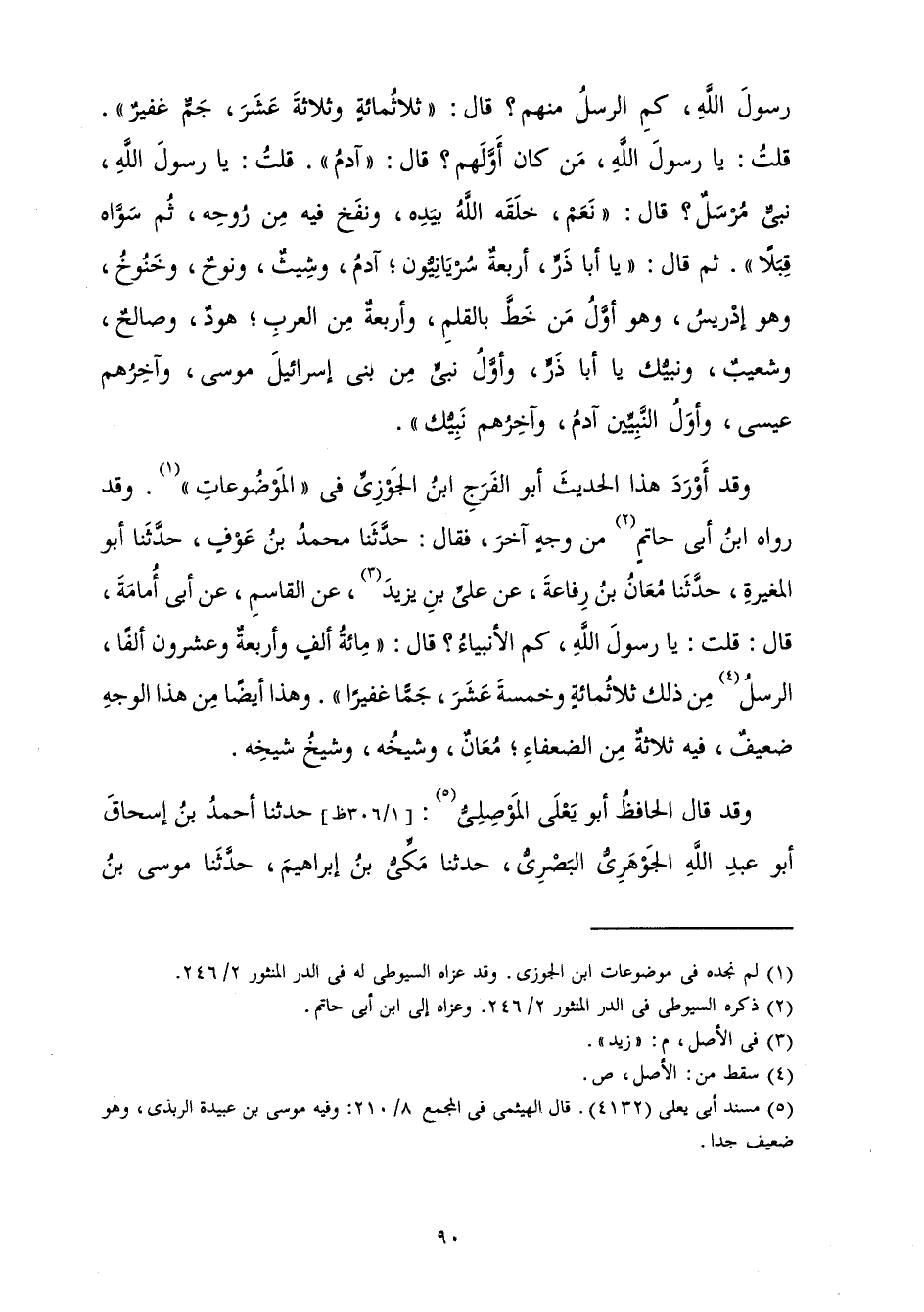 وَقَدْ أَوْرَدَ هَذَا الْحَدِيثَ أَبُو الْفَرَجِ ابْنُ الْجَوْزِيِّ فِي " الْمَوْضُوعَاتِ " وَقَدْ رَوَاهُ ابْنُ أَبِي حَاتِمٍ مِنْ وَجْهٍ آخَرَ فَقَالَ: حَدَّثَنَا مُحَمَّدُ بْنُ عَوْفٍ حَدَّثَنَا أَبُو الْمُغِيرَةِ حَدَّثَنَا مَعَانُ بْنُ رِفَاعَةَ عَنْ عَلِيِّ بْنِ يَزِيدَ بْنِ الْقَاسِمِ عَنْ أَبِي أُمَامَةَ قَالَ «قُلْتُ يَا رَسُولَ اللَّهِ: كَمِ الْأَنْبِيَاءُ؟ قَالَ: مِائَةُ أَلْفٍ وَأَرْبَعَةٌ وَعِشْرُونَ أَلْفًا، الرُّسُلُ مِنْ ذَلِكَ ثَلَاثُمِائَةٍ وَخَمْسَةَ عَشَرَ جَمًّا غَفِيرًا» . وَهَذَا أَيْضًا مِنْ هَذَا الْوَجْهِ ضَعِيفٌ فِيهِ ثَلَاثَةٌ مِنَ الضُّعَفَاءِ مُعَانٌ وَشَيْخُهُ وَشَيْخُ شَيْخِهِ.