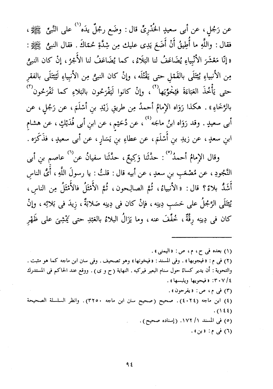 عَنْ رَجُلٍ عَنْ أَبِي سَعِيدٍ الْخُدْرِيِّ قَالَ «، وَضَعَ رَجُلٌ يَدَهُ عَلَى النَّبِيِّ صَلَّى اللَّهُ عَلَيْهِ وَسَلَّمَ فَقَالَ: وَاللَّهِ مَا أُطِيقُ أَنْ أَضَعَ يَدِي عَلَيْكَ مِنْ شِدَّةِ حُمَّاكَ. فَقَالَ النَّبِيُّ صَلَّى اللَّهُ عَلَيْهِ وَسَلَّمَ: " إِنَّا مَعْشَرَ الْأَنْبِيَاءِ يُضَاعَفُ لَنَا الْبَلَاءُ كَمَا يُضَاعَفُ لَنَا الْأَجْرُ، إِنْ كَانَ النَّبِيُّ مِنَ الْأَنْبِيَاءِ يُبْتَلَى بِالْقَمْلِ حَتَّى يَقْتُلَهُ، وَإِنْ كَانَ النَّبِيُّ مِنَ الْأَنْبِيَاءِ لَيُبْتَلَى بِالْفَقْرِ حَتَّى يَأْخُذَ الْعَبَاءَةَ فَيُحَوِّيَهَا، وَإِنْ كَانُوا لَيَفْرَحُونَ بِالْبَلَاءِ كَمَا تَفْرَحُونَ بِالرَّخَاءِ» . هَكَذَا رَوَاهُ الْإِمَامُ أَحْمَدُ مِنْ طَرِيقِ زَيْدِ بْنِ أَسْلَمَ عَنْ رَجُلٍ عَنْ أَبِي سَعِيدٍ وَقَدْ رَوَاهُ ابْنُ مَاجَهْ عَنْ دُحَيْمٍ عَنِ ابْنِ أَبِي فُدَيْكٍ عَنْ هِشَامِ بْنِ سَعْدٍ عَنْ زَيْدِ بْنِ أَسْلَمَ عَنْ عَطَاءِ بْنِ يَسَارٍ عَنْ أَبِي سَعِيدٍ فَذَكَرَهُ.
